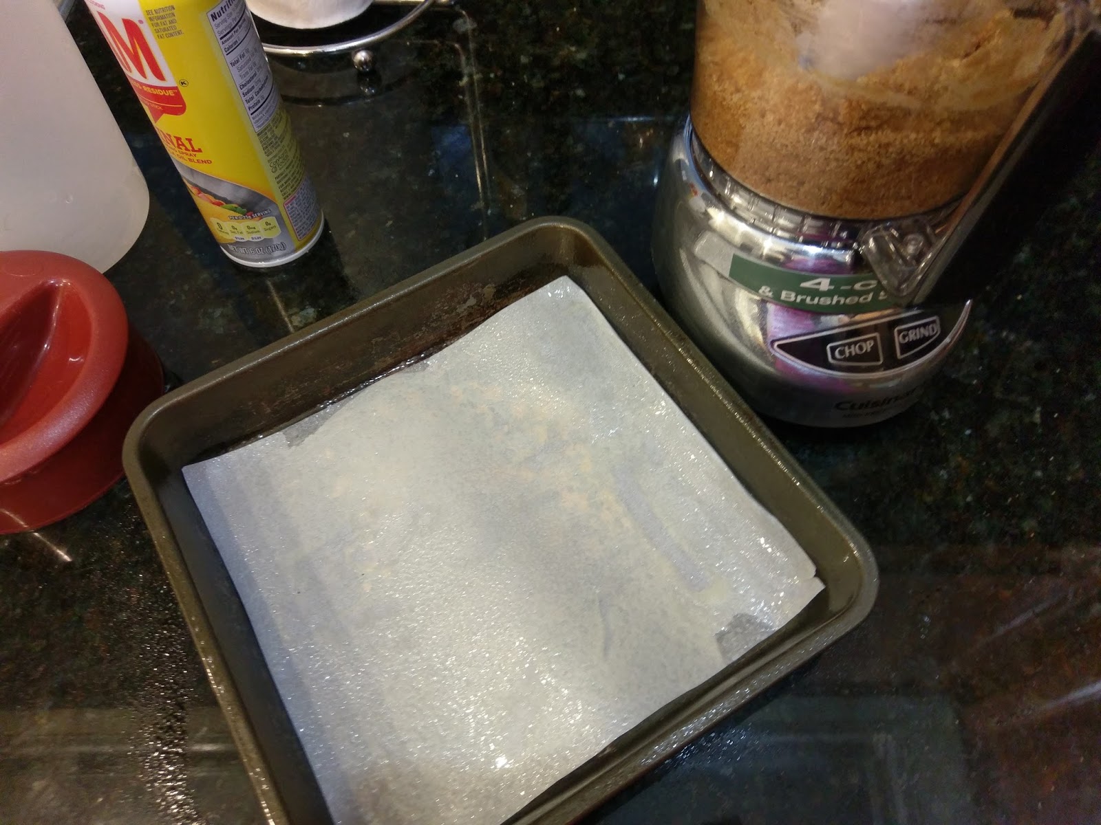 Melt your butter in small bowl for about 25 seconds. While this is nuking, cut a sheet of Parchment paper to fit an 8×8 pan. Mist the paper and the edges of the pan with cooking spray.