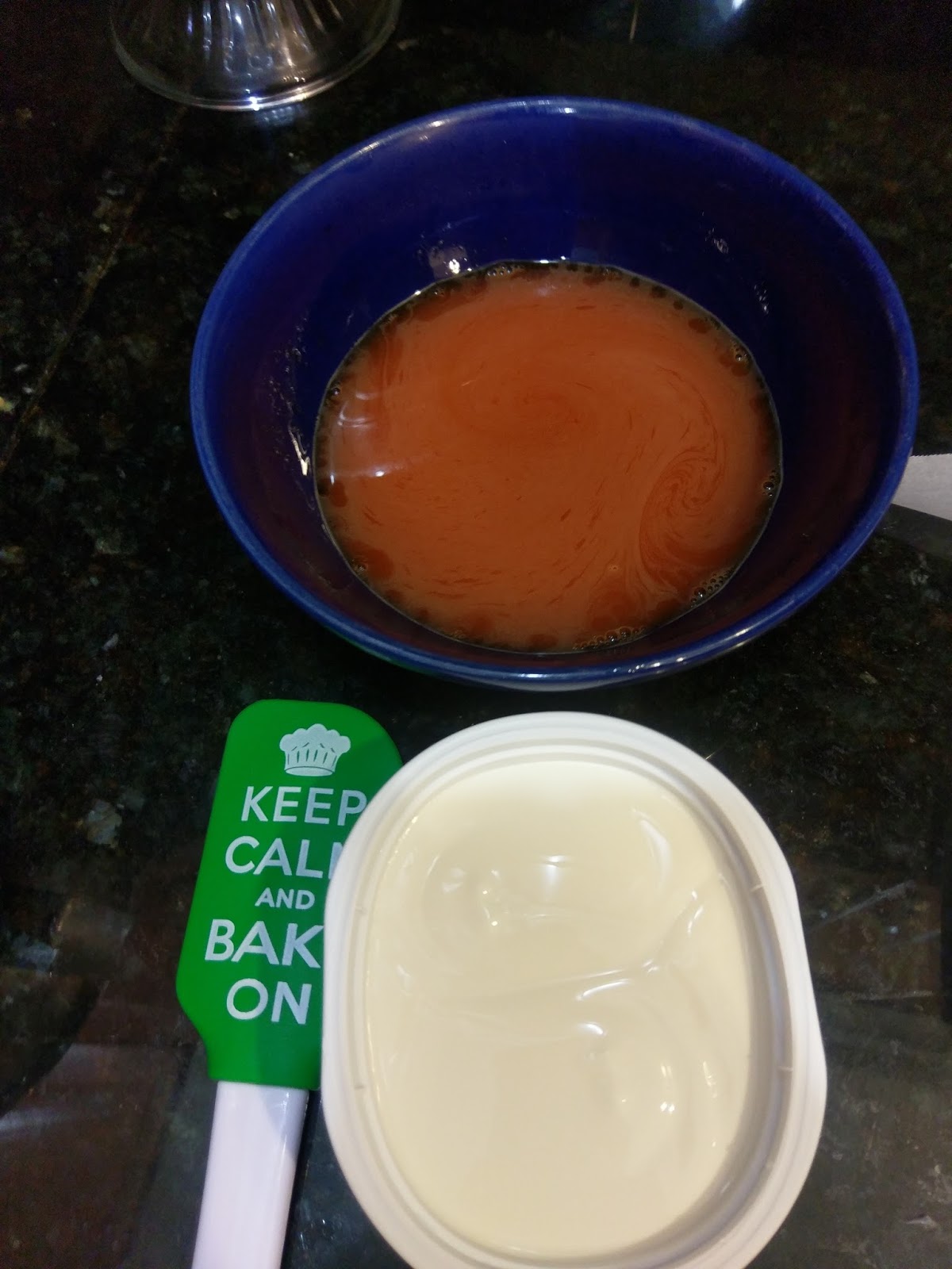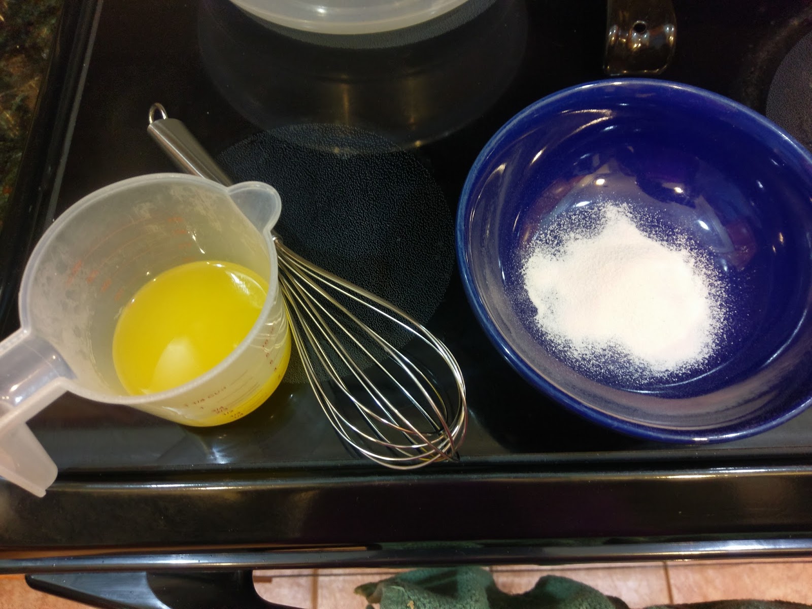 Find a microwaveable liquid measuring cup and measure out the 1/2 cup of OJ. You’re going to heat this in the microwave for 1 minute. While it is getting warmed up, dump the orange Jello mix into a bowl. Pour in the hot OJ (weird) and whisk for 2 minutes. There should be no clumps.