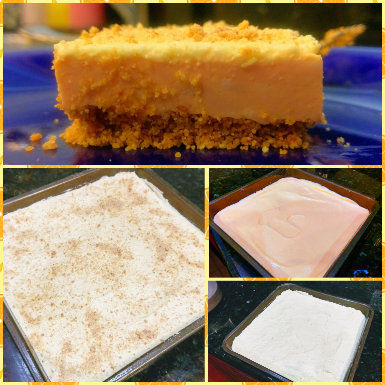 It’s the time of year when I frequently have Wicked Witch of the West moments because I literally feel like I’m melting every time I set foot outside. When it’s 6 a.m. and the real feel is 90, you know it’s gonna be a long day. I try to combat the heat by complaining about it as much as humanly possible while simultaneously thanking the inventor of air conditioning and counting down the days until our Alaskan cruise. Let’s face it–while I may be from Texas, I’m about as well equipped to handle heat as a pint of Blue Bell. The only thing that summer is good for as far as I’m concerned is delicious, fruity desserts to help deal with the misery that is sweating while standing perfectly still. When I looked at the forecast for the week (and stopped crying), I decided it was time for a creamy, light-as-air dessert. I wanted something that would give me a respite from the heat, so immediately, I thought citrus fruits. And when you live in a state that’s kind of known for one in particular, it seemed only natural to base my dessert around the tasty and ever-so-hard-to-peel orange. Although, my childhood soccer games would’ve been woefully incomplete without orange slices at halftime, so I’ll give them a pass on having an exterior more difficult to crack than most safe vaults. Say hello to the Orange Creamsicle Bar…