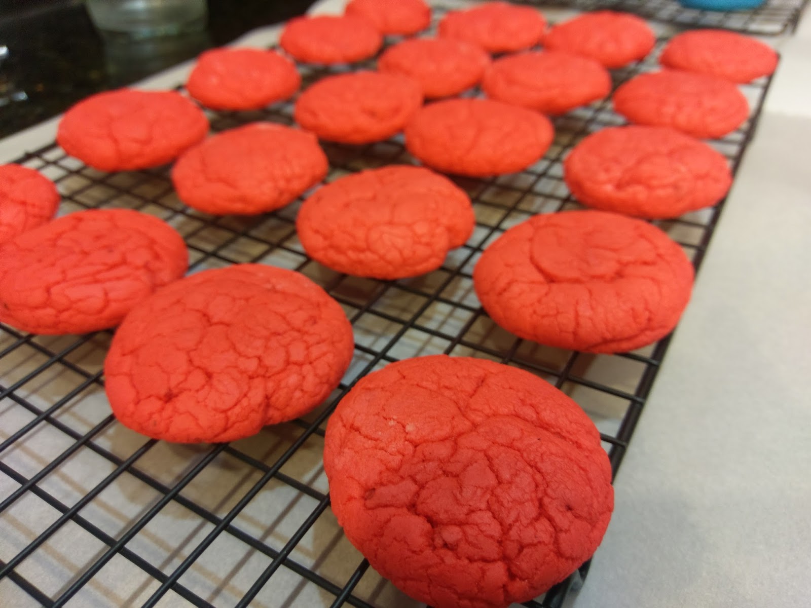 For my strawberry cookies, I followed the same process: mix butter, egg, and cake mix for 2 minutes, add red gel dye, mix, and let rest for 10. Scoop, shape, flatten, and bake for 10 minutes. Let cool on a cooling rack.