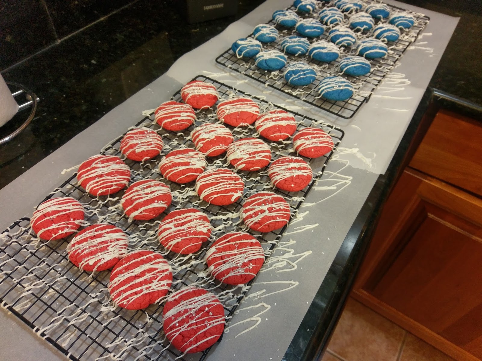 There’s no wrong way to do this, so with a ton of gusto, I drizzled my piping bag of chocolate melts back and forth over all my cookies. Work quickly; while the chocolate is still wet, you then need to add whatever sprinkles you want on top of your cookies so they will stick.