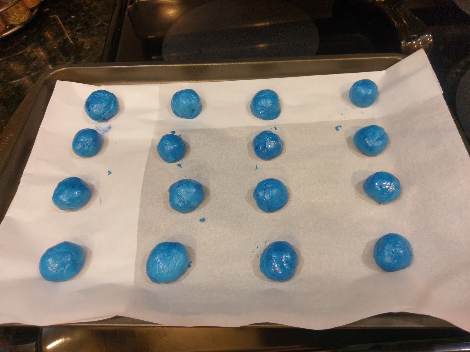 Preheat your oven to 350. Mix the melted butter, egg, and white cake mix together for 2 minutes. Add several drops of blue food color to achieve a nice hue. **You must, must let this mix rest for about 10 minutes.** This allows the dough to firm up a bit so it is easier to handle and shape the cookies. Use a 1/2 tablespoon measuring spoon and scoop out 20 balls of dough. I spray my 1/2 tablespoon with cooking spray to help release them, and then give a quick swirl in my hands to round them out and flatten them a bit: