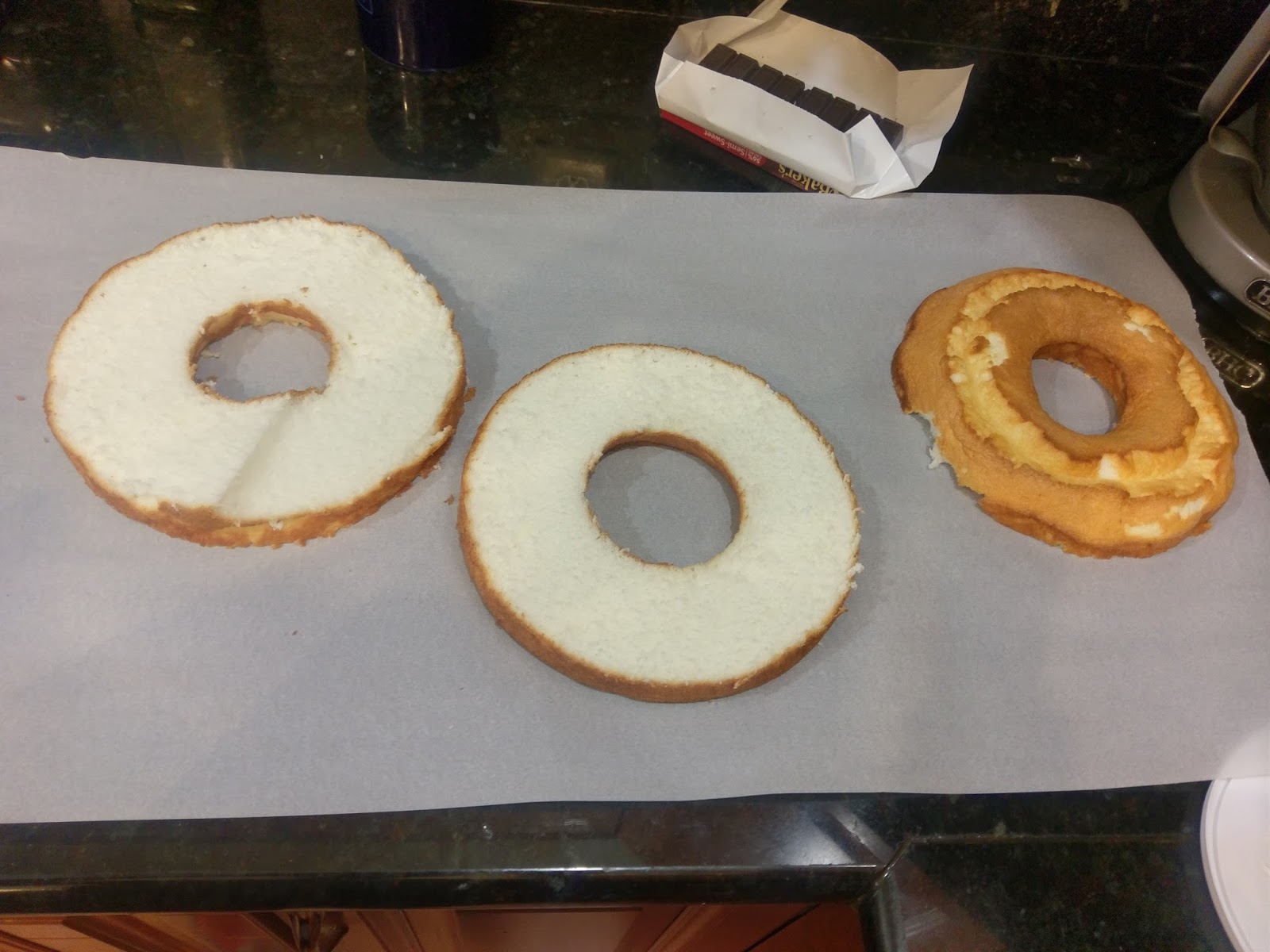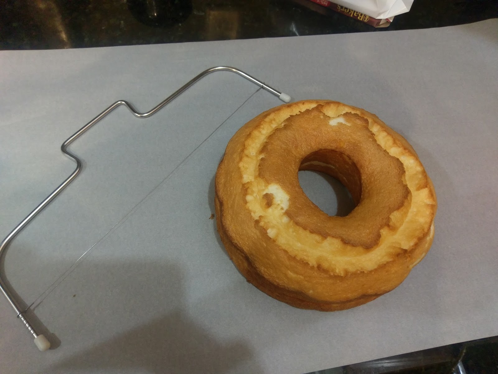 You will need to tort your cake into three layers. I use my cake leveler, but a long serrated knife would also work if you don’t enjoy the feeling of using garotte wire to mutilate a cake. It’s a lot more fun than it sounds, I promise.
