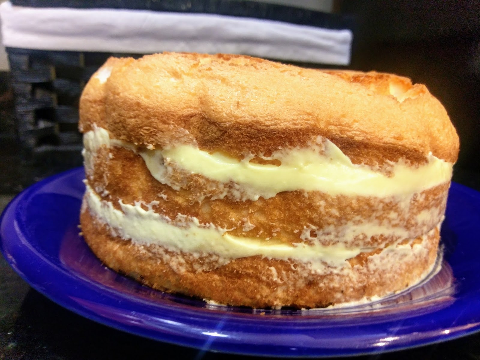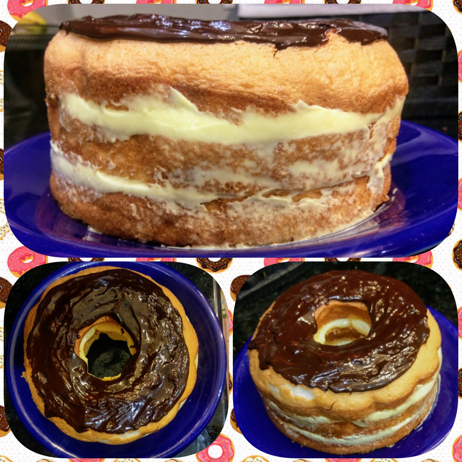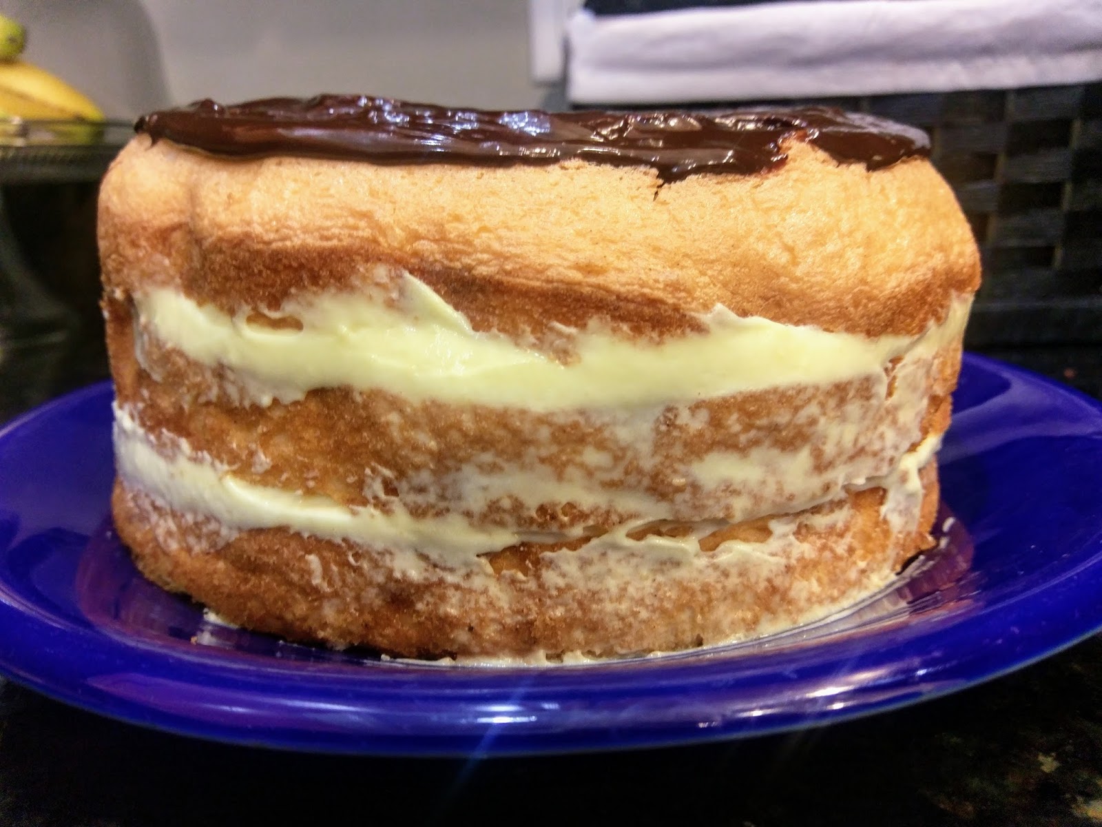 When I was but a wee child, I had an insatiable sweet tooth. I realize the irony in typing that as at the age of 30, I sit here eating cinnamon Graham Crackers topped with peanut butter. If you had told me when I was five that I’d still be eating the same lunch over two decades later, I would’ve been thrilled considering both my love of peanut butter and hatred of change. But the only thing I loved more than routine was eating donuts the size of my head or pancake stacks taller than me. Come to think of it, this still applies. The only thing different now is that I’m familiar with the concepts of guilt and feelings-eating (oh, the parallels!). Ah, to be an innocent, gluttonous child once more. I may still have the metabolism of a hyperactive child in a sugar-fueled rampage, but I try my best to eat healthy. I have been craving a Boston cream donut to the point where I get a little drool-y when I drive by a Dunkin’ Donuts, and I knew my sweet tooth/inner child was going to win out eventually. It was just a battle of wills between satisfying my donut lust while simultaneously still fitting comfortably into skinny jeans. In case you were wondering, yes, it is positively exhausting being this crazy. But the insanity sometimes results in pure genius–like this Boston cream angel food cake.