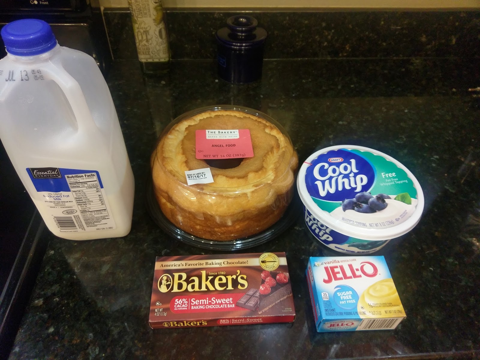 The worst part about making this Boston cream angel food cake was having to step foot inside of a Walmart to get a premade angel food cake. Thankfully, having to avoid being touched and/or breathed on by anyone else inside of a Walmart only occurs about once a year instead of weekly now that we don’t live in Clovis. Small sacrifices. To make this heavenly (see what I did there) angel food cake, you need: