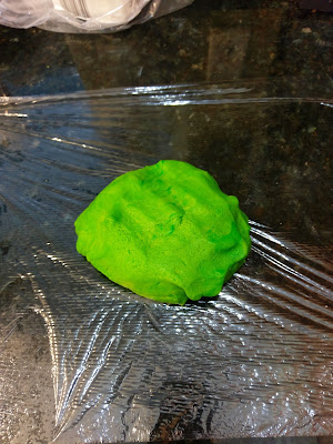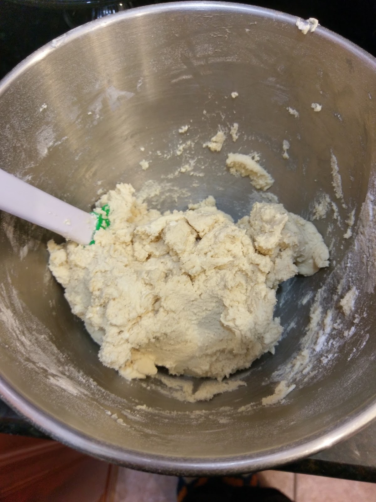 Now, plop a bunch of green dye in with the dough still in the stand mixer bowl. Blend on low until everything is the most obnoxiously bright shade of green in the world.