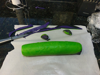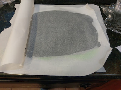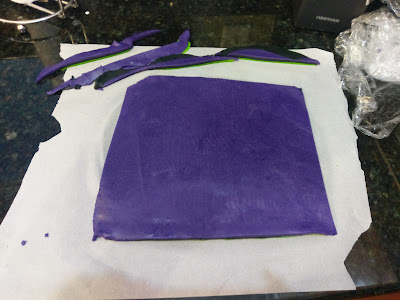 Now, once the dough has firmed up, take the green layer and remove it from all its plastic wrap. Plop it down on a sheet of wax paper. Take the black dough and remove one side of the plastic wrap. Plop the side without any plastic wrap face down on top of the green dough. Then remove the other side of plastic wrap/wax paper. Finally, repeat this process by layering the purple dough on top of the black. I covered this final sheet with wax paper and smoothed the layers together by rolling over them a few times with my rolling pin.