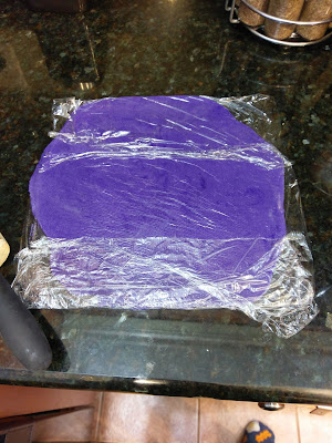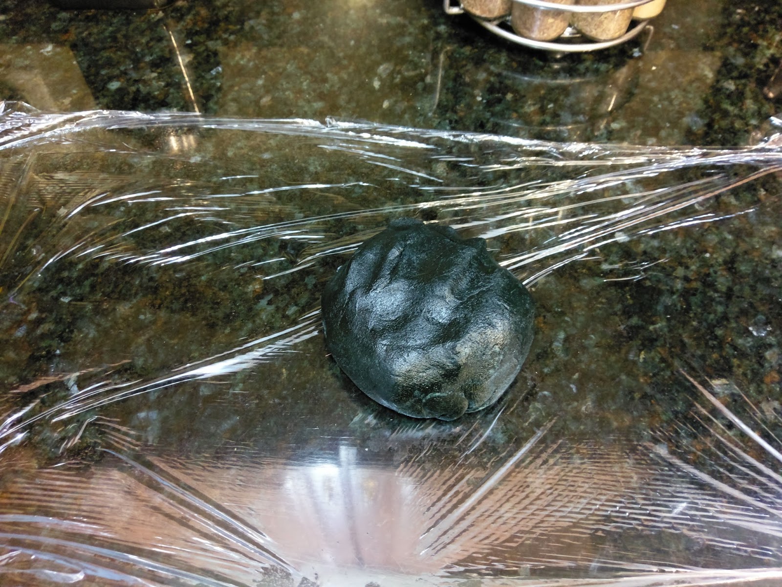Take the purple dough and turn it out onto a separate sheet of plastic wrap. Finally, wash out the bowl one last time, add the last dough ball, and dye this one black. It’ll need its own sheet of plastic wrap.