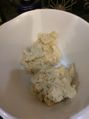 Now, split the dough into thirds. Keep one third in the stand mixing bowl. Wipe out the bowl that had the flour mix, and then plop in the remaining dough, split into two equal parts: