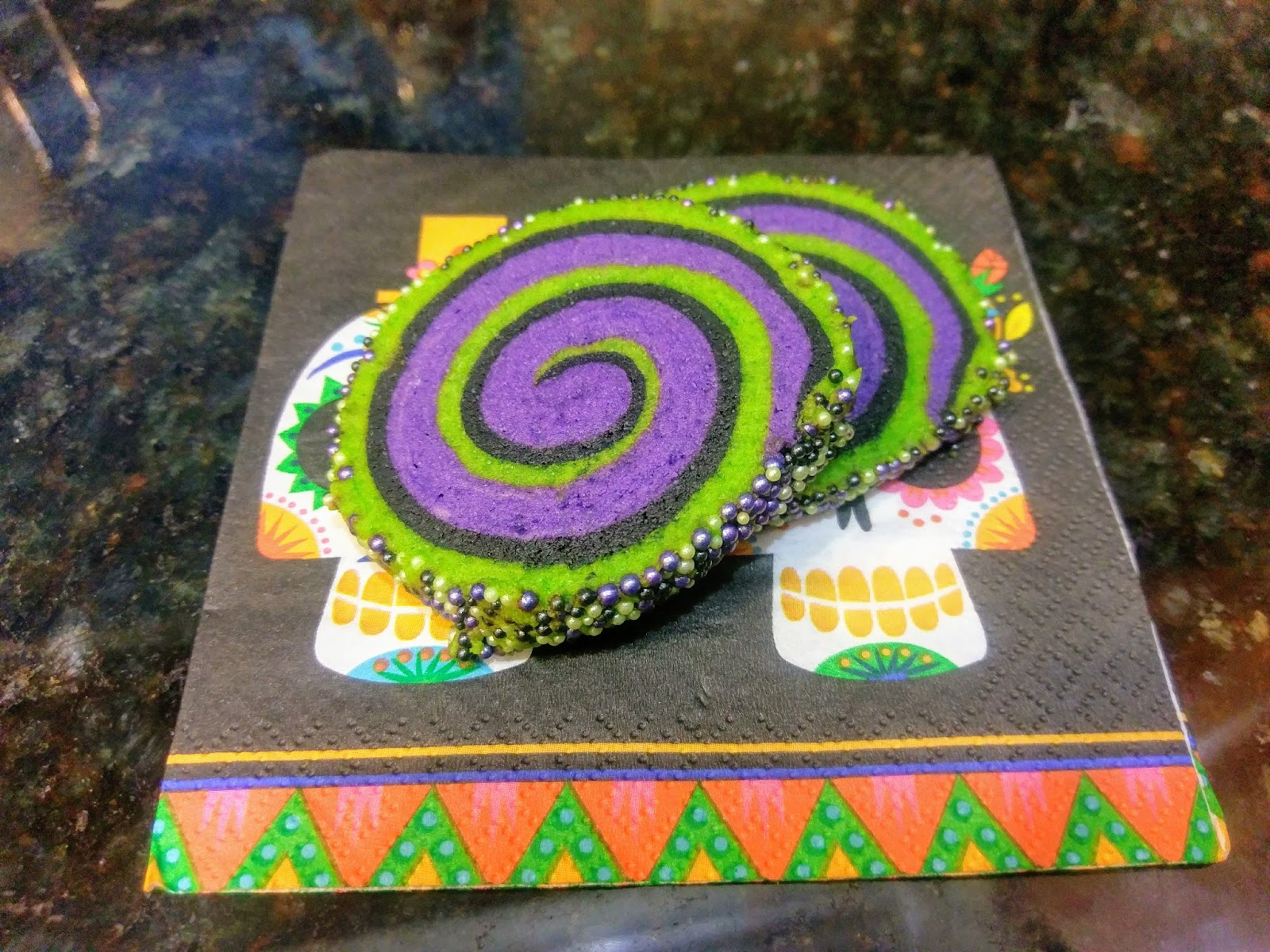 Once cooked, things will look firm but still a tiny bit shiny. Let the cookies rest on the cooking sheet for 5 minutes, then remove to a cooling rack. Continue baking for 10-11 minutes until you’ve sliced up and baked all your dough. Let completely cool until storing in an airtight container with a slice of bread (keeps the cookies fresh). These really are the perfect way to welcome you and your loved ones to the best month of the entire year. They’re bewitching, and by bewitching, I mean super buttery. Like the Halloween equivalent of a Spritz cookie. Not too sweet, but certainly very rich. And they just look awesome. I giggle with evil delight every time I walk by them in the kitchen. I’m beyond ready to show our neighborhood just how weird I am when I put our outside decorations up tomorrow. Lookout world, I’m here to scare the living crap out of you! While enjoying some bewitching pinwheel cookies. On sugar skull napkins. Because I wholeheartedly throw myself into Halloween like a member of the Addams family. I never had a butler growing up, but otherwise, the similarities between my family and theirs is pretty astounding. A family that scares together, stays together! ‘Til next time, my fellow eaters!