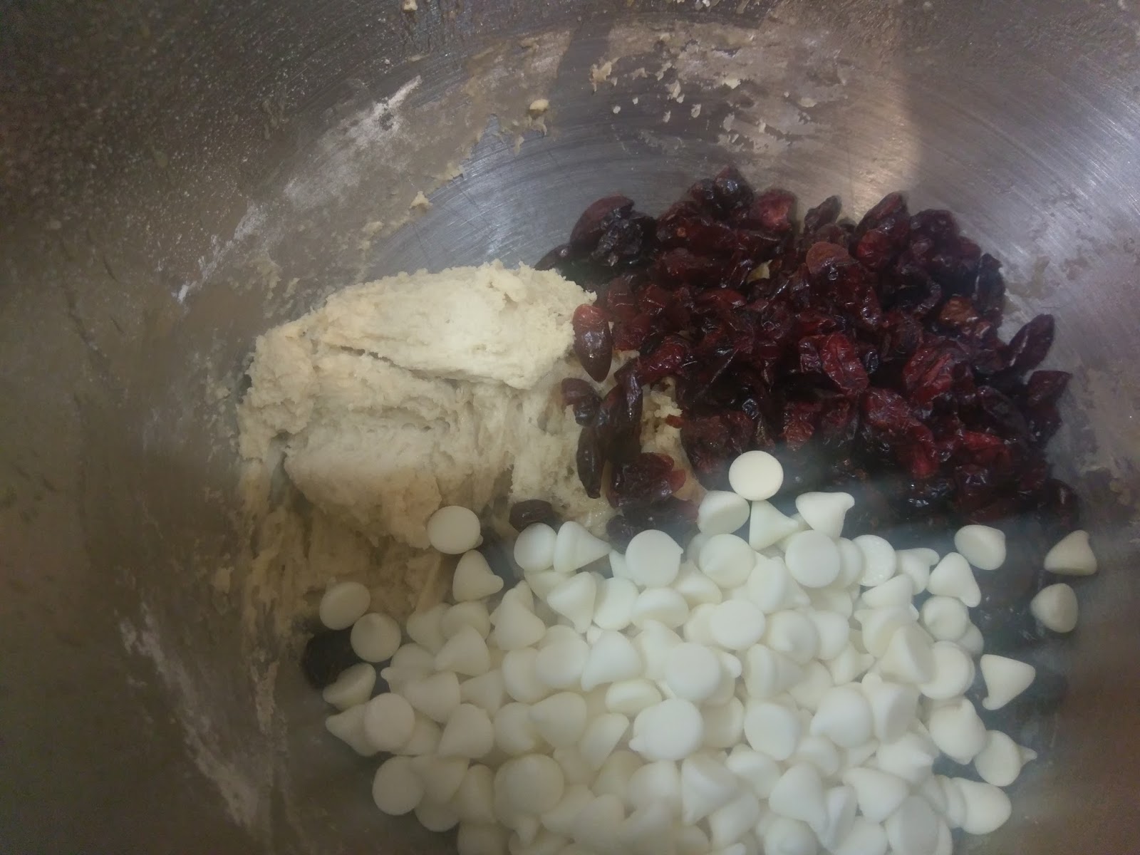 I won’t lie–not the biggest fan of white chocolate. I really only like it in cookies. I once had a white chocolate macadamia nut cookie so good, it converted me into both a white chocolate chip and a macadamia nut lover. But my personal eating history aside, now you’ll want to add in the cup of chips and the cup of dried cranberries. Blend on low. Your mixer will sound like it’s either dying or trying to become sentient to kill you for making it mix so many chips. I may have watched Maximum Overdrive recently.