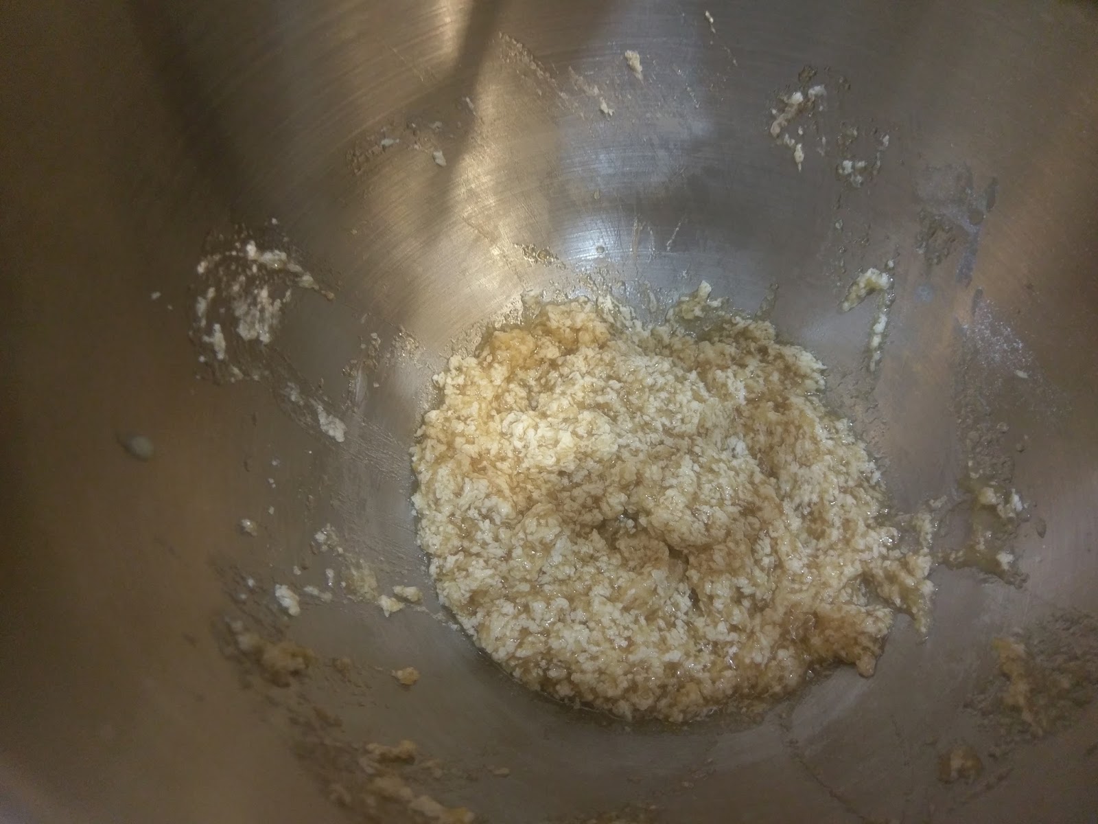 Now, if you’re on Team Crunchy, preheat your oven to 350 and line a few baking sheets with Parchment paper lightly misted with cooking spray. My fellow Team Fluffy folks, don’t preheat your oven yet. Regardless of your cookie texture preference, start by creaming the butter, both Truvias, and the applesauce for a few minutes in your stand mixer (use the paddle!). Scrape down the bowl before adding anything else. Things are going to look a lot like oatmeal when they’re all mixed: