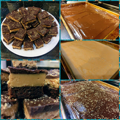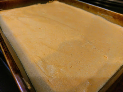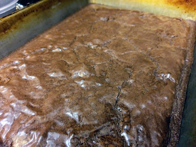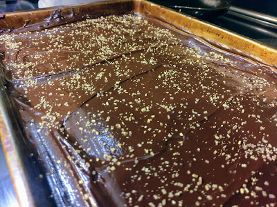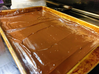 Now, the moment those brownies come out of the oven, take your peanut butter mixture and spread it on top of the warm brownie layer using an angled spatula. I heated my spatula up under warm water, dried it off, and then spread out the PB layer. Worked like a smooth, delicious dream. Set this aside and get ready to ganache, baby.
