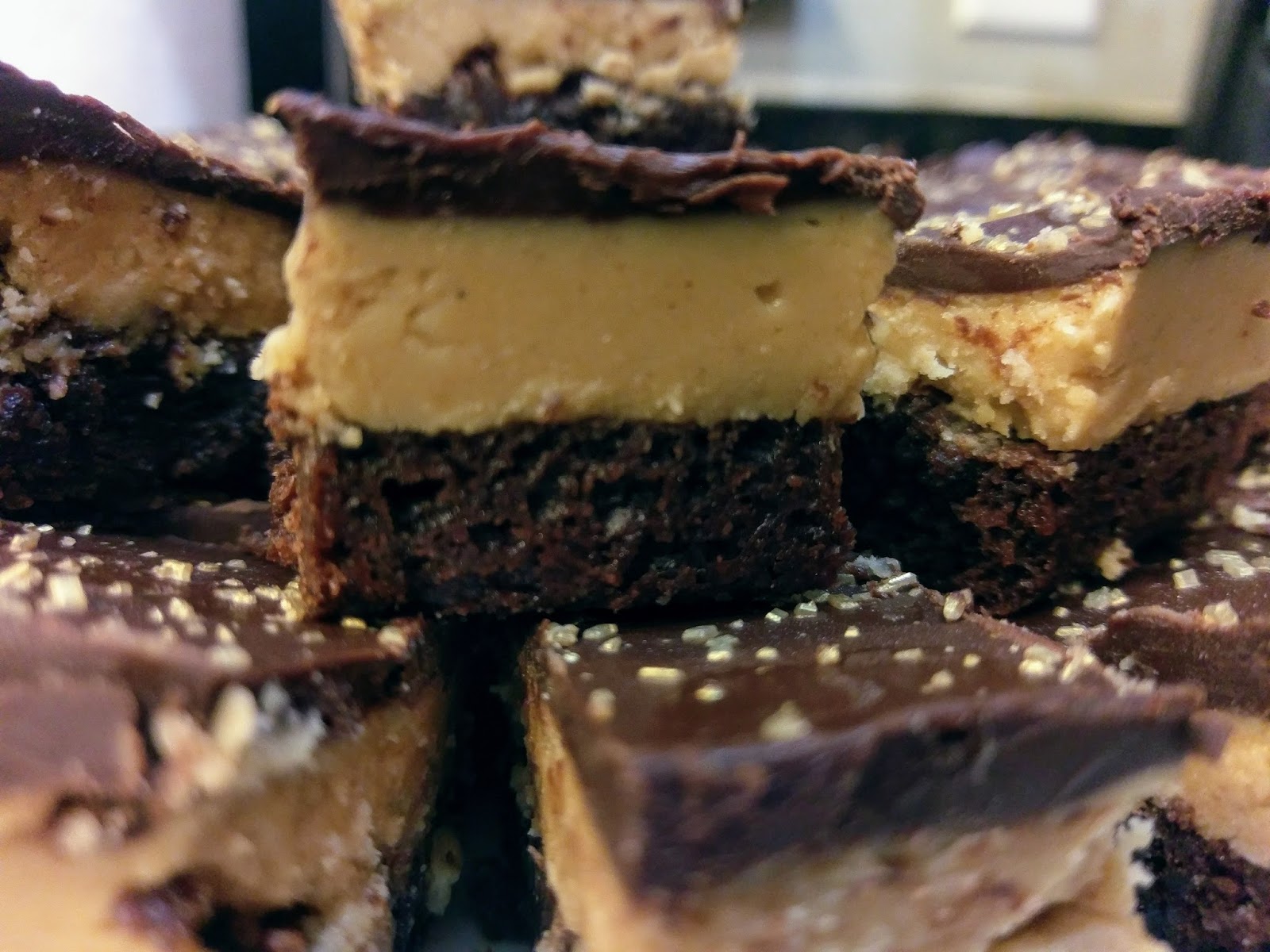 Honestly, these are terrible for you. HOWEVER, they are also extremely rich and decadent, so you could get away with slicing these even smaller than I did. I made a 9×13 pan and cut them into 36 brownies for 320 calories a brownie. I ended up cutting a piece in half when I ate it because they were so rich and positively the perfect amalgamation of peanut butter and chocolate (so naturally, I had seconds). You could easily cut these into 48 squares to get them under 250 calories a serving. While they may not be New Year’s resolution friendly, if you ever have a terrible week and need to eat your feelings, might I recommend this recipe. I’d let someone punch me in the face if it meant I could have one of these right after–they’re really that good and great at lifting one’s spirit. Behold, the magic of PB&C. Those crazy Ohioans are really onto something with Buckeyes (but only in the realm of food. Not football. Never.).