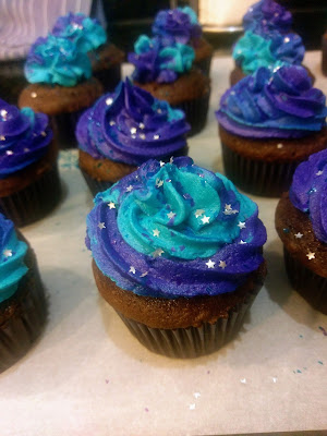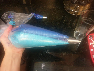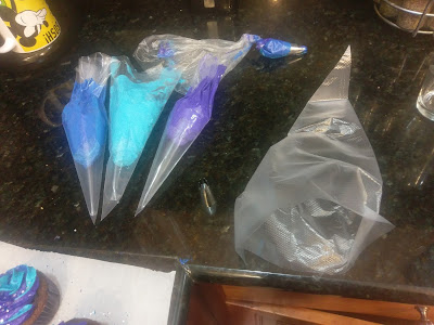 For my galaxy swirl cupcakes, I used Americolor’s electric blue and royal blue, and Wilton’s violet dye. I put equal amounts of frosting into three separate bowls, and then used the following combination in one bowl: 6 drops of electric blue plus 2-3 drops of royal blue and mixed well to achieve a bright blue hue. In another bowl, I mixed 6 drops of royal blue and 2-3 drops of violet to achieve a deep navy (photos don’t do it justice) and mixed well. Finally, I used 6 drops of violet and 2-3 drops of royal blue for what I call “Vikings purple” (but don’t worry, it won’t choke when you need it to work most). I got out three piping bags, and I added half of the electric blue to one bag, half of the navy blue to another bag, and half of the purple to a final bag. I snipped the tip off of each of these three bags and then fit a HUGE (see that trash bag on the right above) piping bag with a 1M tip and gently loaded each bag of frosting inside as evenly as I could: