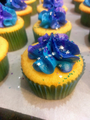 Wilton has adorable gold or silver stars and edible flakes in a million colors, so find colors that compliment whatever dyes you chose for your galaxy swirl. I pipe about 4 cupcakes, stop, and add sprinkles while the frosting is still “wet” and not set.