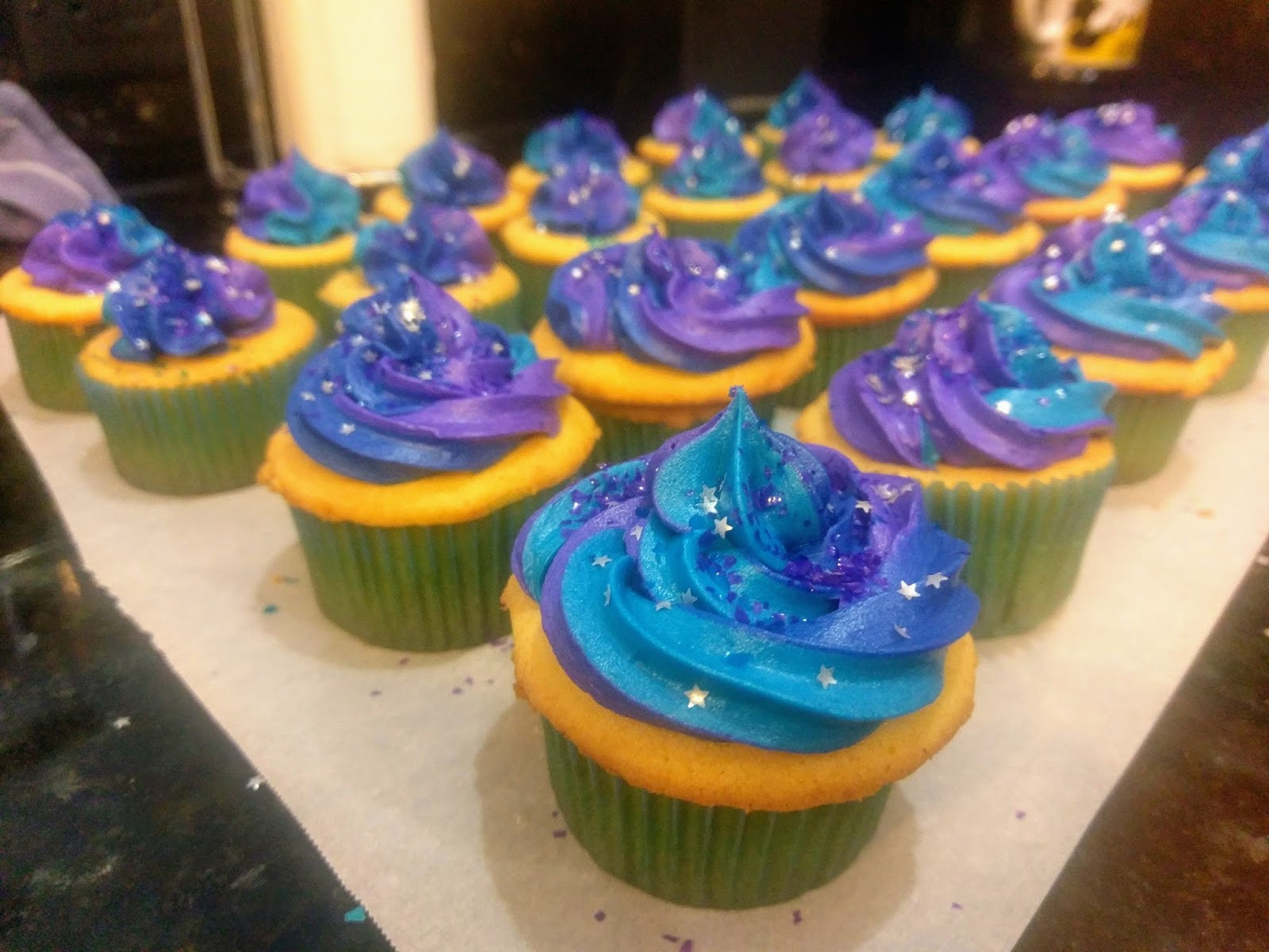 For my galaxy swirl cupcakes, I used Americolor’s electric blue and royal blue, and Wilton’s violet dye. I put equal amounts of frosting into three separate bowls, and then used the following combination in one bowl: 6 drops of electric blue plus 2-3 drops of royal blue and mixed well to achieve a bright blue hue. In another bowl, I mixed 6 drops of royal blue and 2-3 drops of violet to achieve a deep navy (photos don’t do it justice) and mixed well. Finally, I used 6 drops of violet and 2-3 drops of royal blue for what I call “Vikings purple” (but don’t worry, it won’t choke when you need it to work most). I got out three piping bags, and I added half of the electric blue to one bag, half of the navy blue to another bag, and half of the purple to a final bag. I snipped the tip off of each of these three bags and then fit a HUGE (see that trash bag on the right above) piping bag with a 1M tip and gently loaded each bag of frosting inside as evenly as I could:
