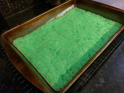 Preheat your oven to 350 and line a 9×13 tray with Parchment and spray with cooking spray. In a stand mixer, blend your butter and Swerve together until fluffy (3 minutes). Add in each box of pudding mix, one at a time, mixing well before each addition. Add in your eggs, extracts, a few drops of gel dye, and blend well. In a small bowl, blend the flour, baking powder, and salt together. Dump half the mix into the wet ingredients and blend. Add the rest of the dry mix until just incorporated. The dough will be stiff since this is a cookie batter.