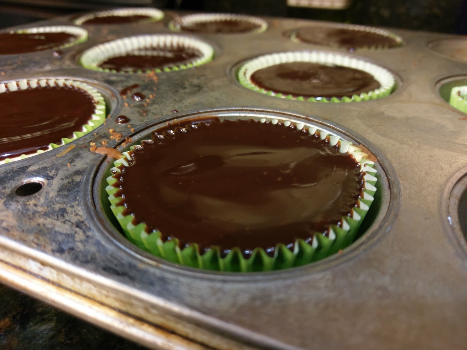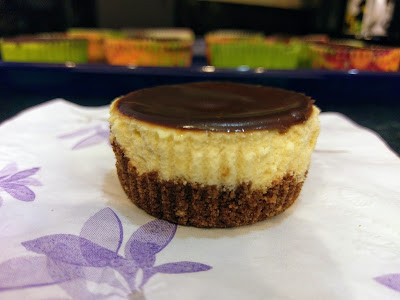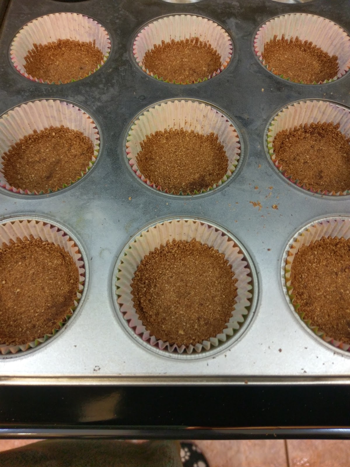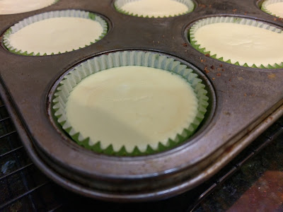 Preheat your oven to 350 and line two muffin tins with 20 cupcake liners. Take about 1.5-2 TBS of the crust and dump into each liner. I used a shot glass (fitting) to smoosh the crust down and even it out. Bake your crusts for 8-10 minutes until tanned but not burnt (the exact opposite of what happens to my skin after 8-10 minutes in the sun). Let these rest on a cooling rack and lower your oven temp to 325.