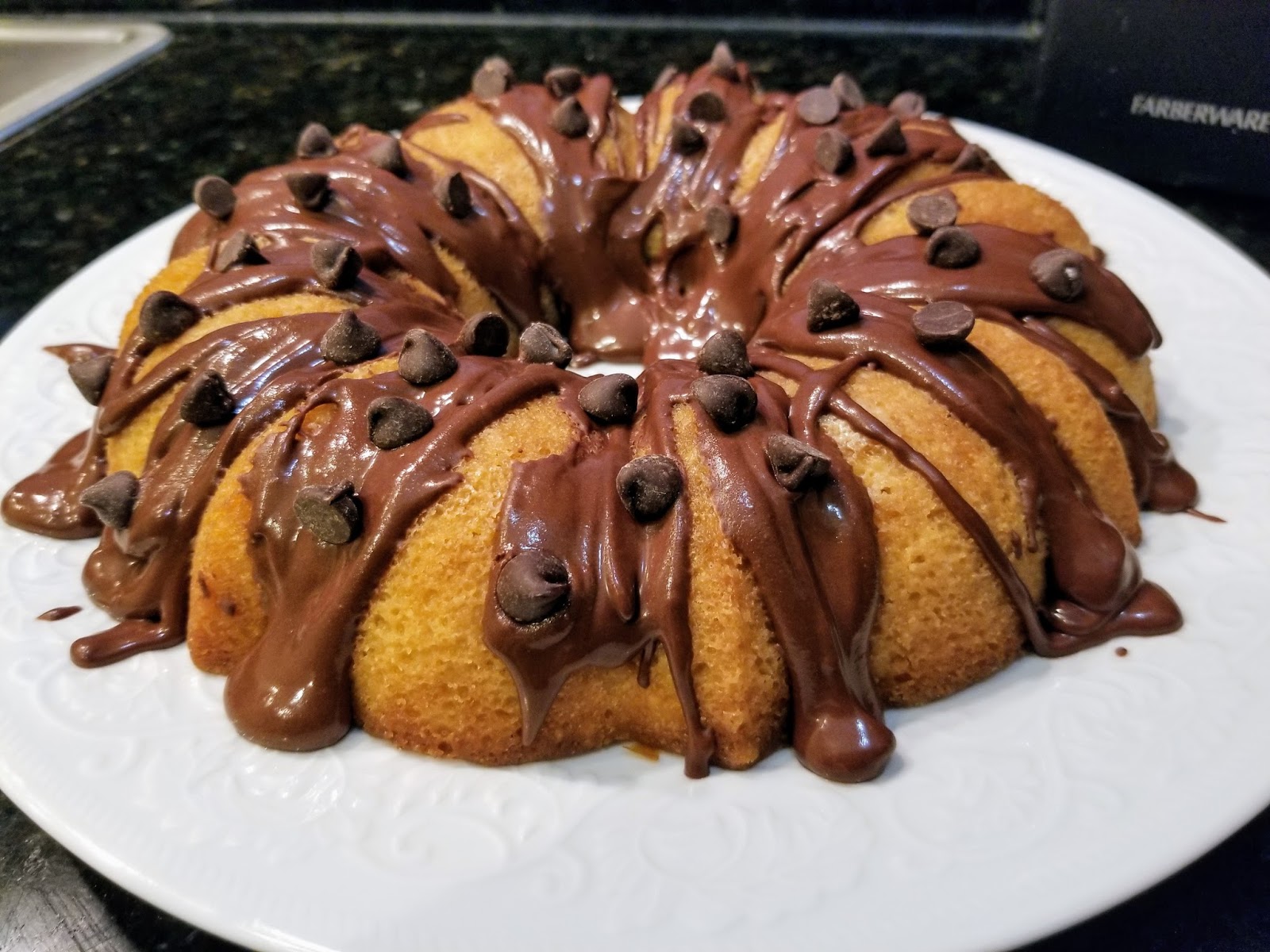 Finish up by placing the chocolate chips onto the ganache, and you’ve got nothing bundt deliciousness on your hands. See what I did there? Yeah, a terrible pun becomes funnier with age. Otherwise, Dad Jokes wouldn’t exist. This cake does have cream cheese in it, so keep it in the fridge until you’re ready to serve. I highly recommend warming up your slices in the microwave for a few seconds so that fudge layer gets all melty and delicious…