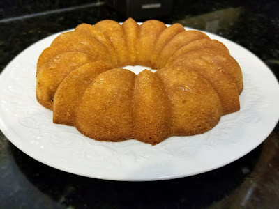 Then bake your cake at 325 for 45-50 minutes. Your cake should have a nice golden coloring when it’s finished, and a toothpick inserted on the center edge and outside edge should come out of the cake clean. Let it rest on a cooling rack **while still in the pan** for 10-15 minutes. I cooked mine for 50 minutes, but it probably would’ve been wise to take out of the oven at 45. *Slightly over baked,* but still delicious.