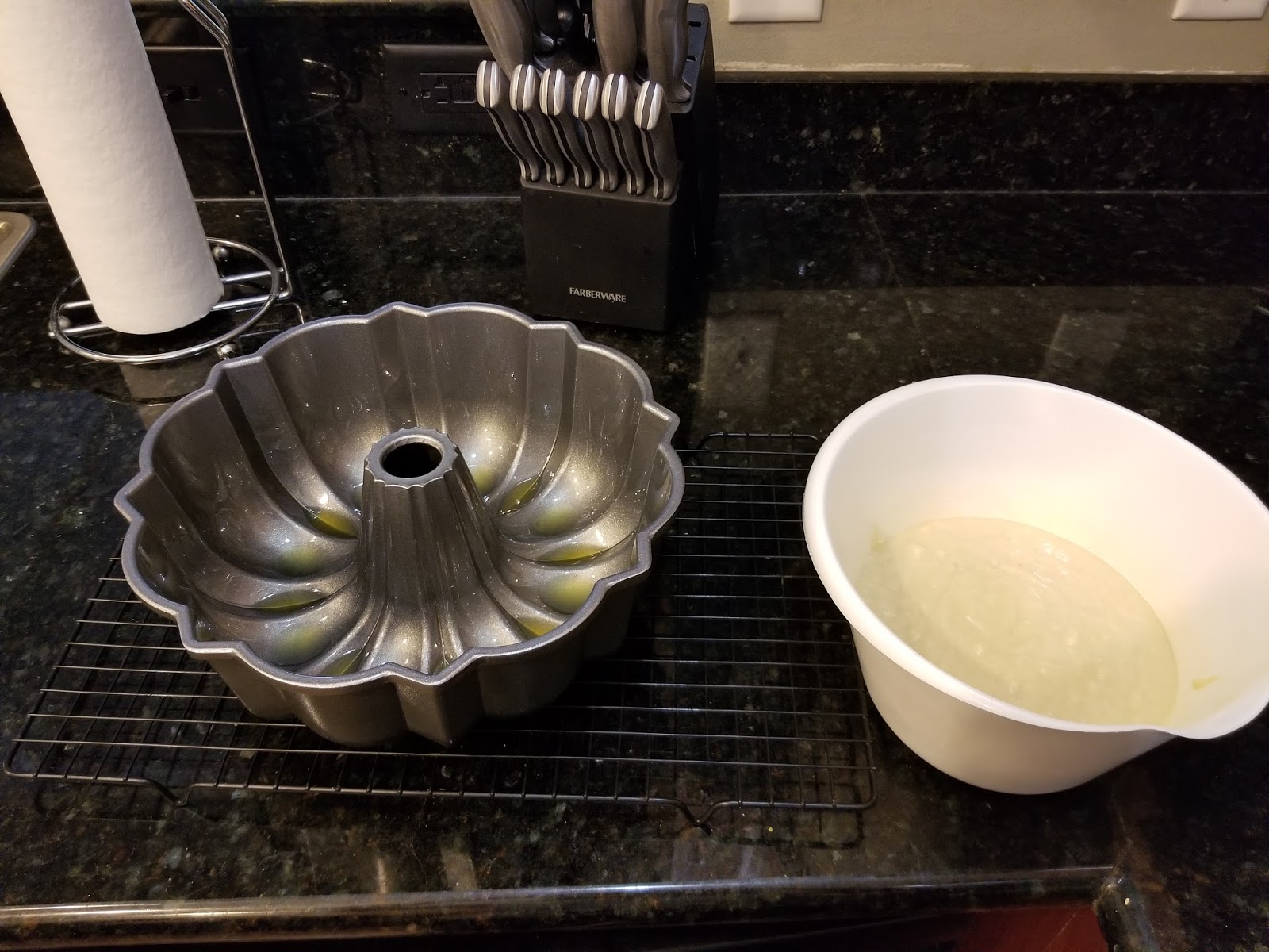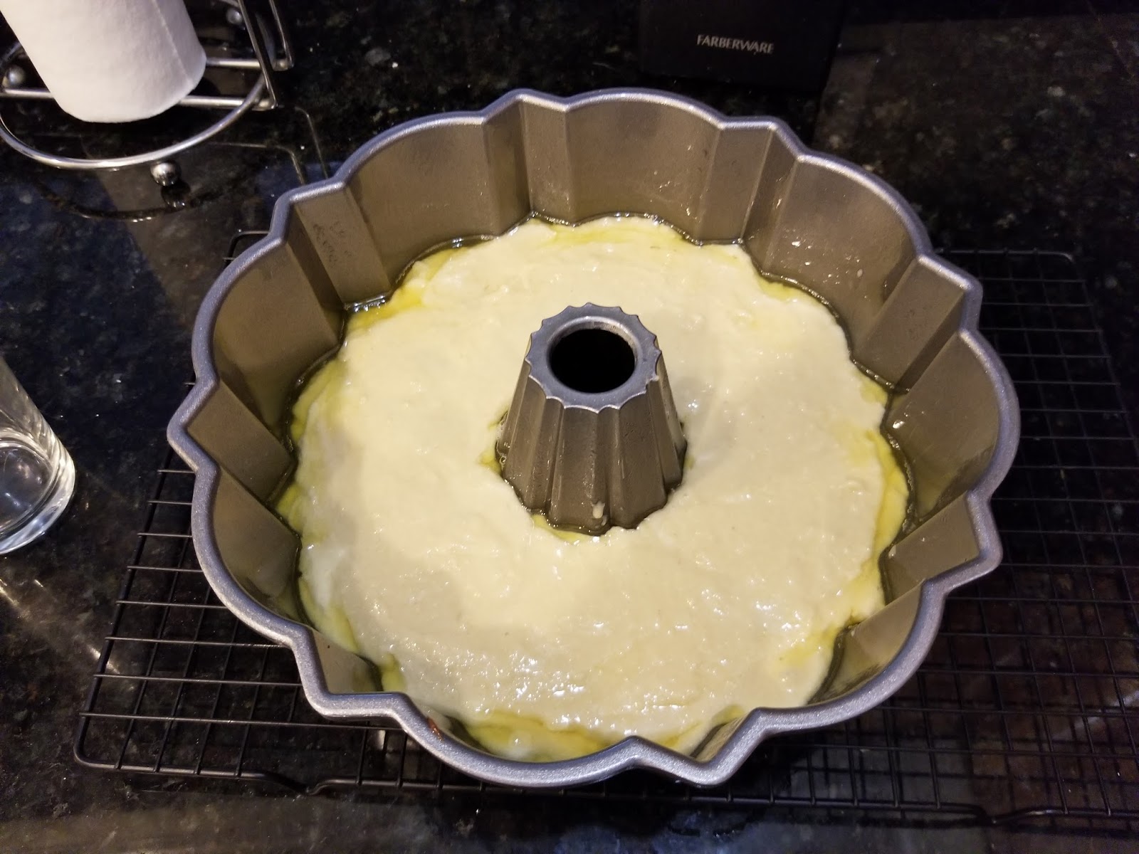 | Now, take 2/3 of the cake batter and place it in your “so greased it could cause a kitchen fire” cake pan. |