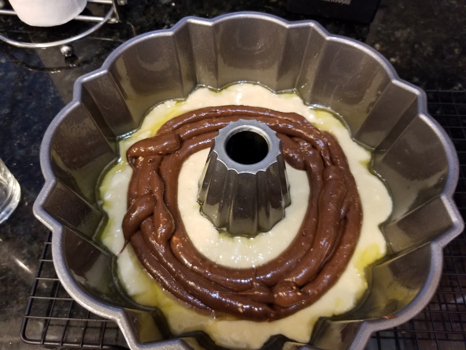 | Then pipe a few circles of fudge in the middle of the cake. Make sure it isn’t touching any edges of the pan. This does not look appetizing. This is a bad “daaaaaamnnnnn.” |