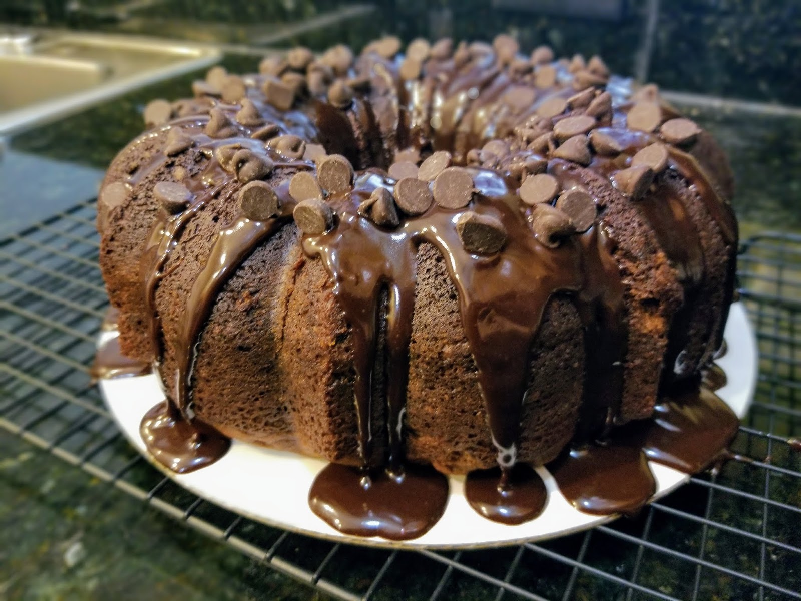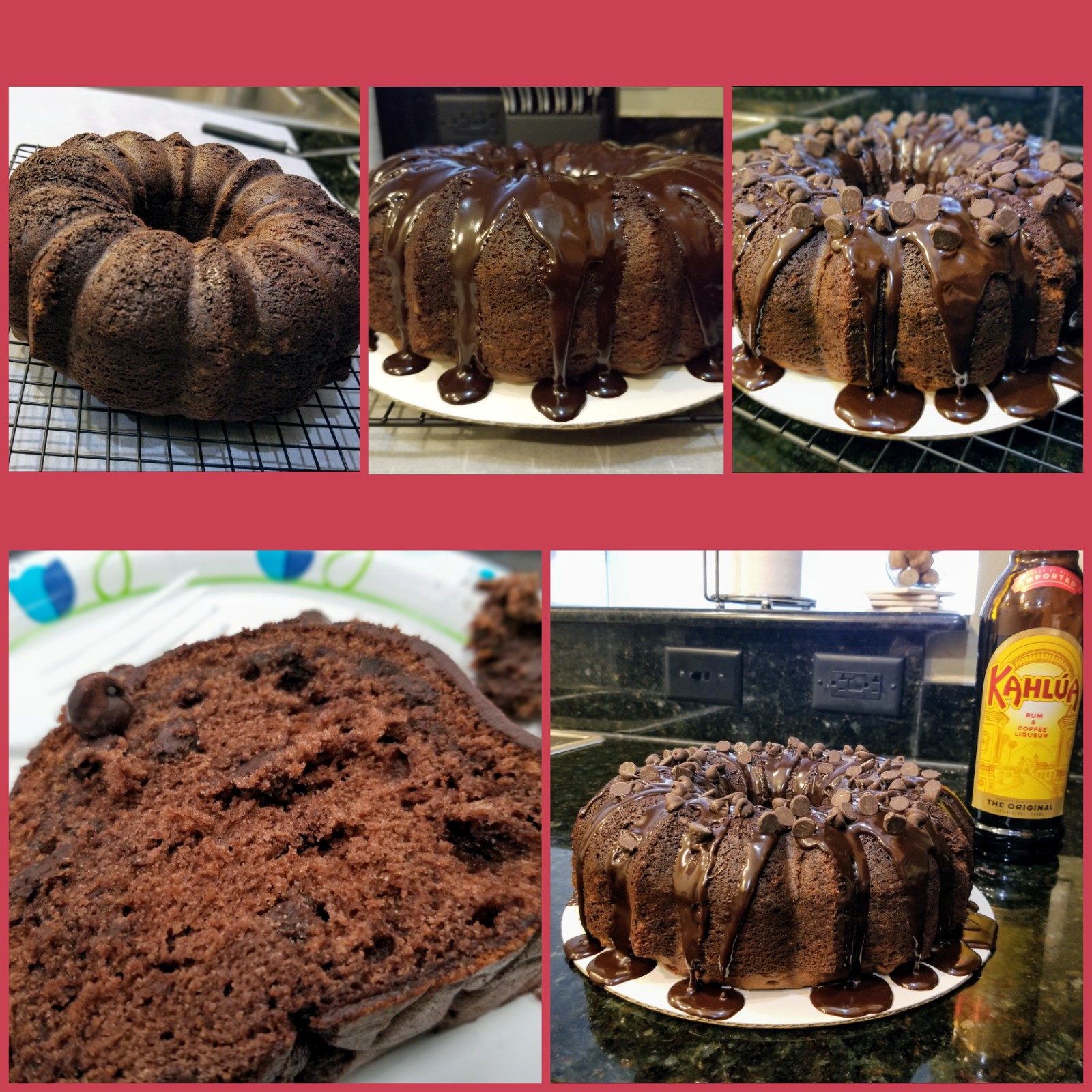 I have been crazy about bundt cakes recently. When you have to bake on a tight schedule and know there’s not much time for decorating, the bundt pan takes care of the heavy lifting for you with its intricate design. So, if you’re a lazy baker, bundt pans are your bestie. This chocolate chip Kahlua bundt cake with Kahlua ganache in no way comes across as a lazy-looking or tasting bake by any means. It has the right balance of dark chocolate, booze, and sweetness. I really hate the word, but moist is literally the only way to describe the texture. It practically melts on your tongue. So it’s great if you’re even feeling to lazy to chew! …we’ve all had those days. I wish I could tell you I somehow managed to make this cake low cal, but that would be a lie. Birthday calories don’t count, you see (and other lies I tell myself) –an additional working title for my autobiography. If you make this into 20 servings, each slice will knock you back 358 calories. Not terrible by any means, but a typical bundt cake’s 16 servings is 448 calories a slice, which fills me with an urge to go run five miles before I eat it, and I’m not even a runner (I’m told running from your problems does not count). In the end though, this cake is worth any and all calories because it holds within it the power to provide the eater with a solid 1-hour post-cake euphoria.