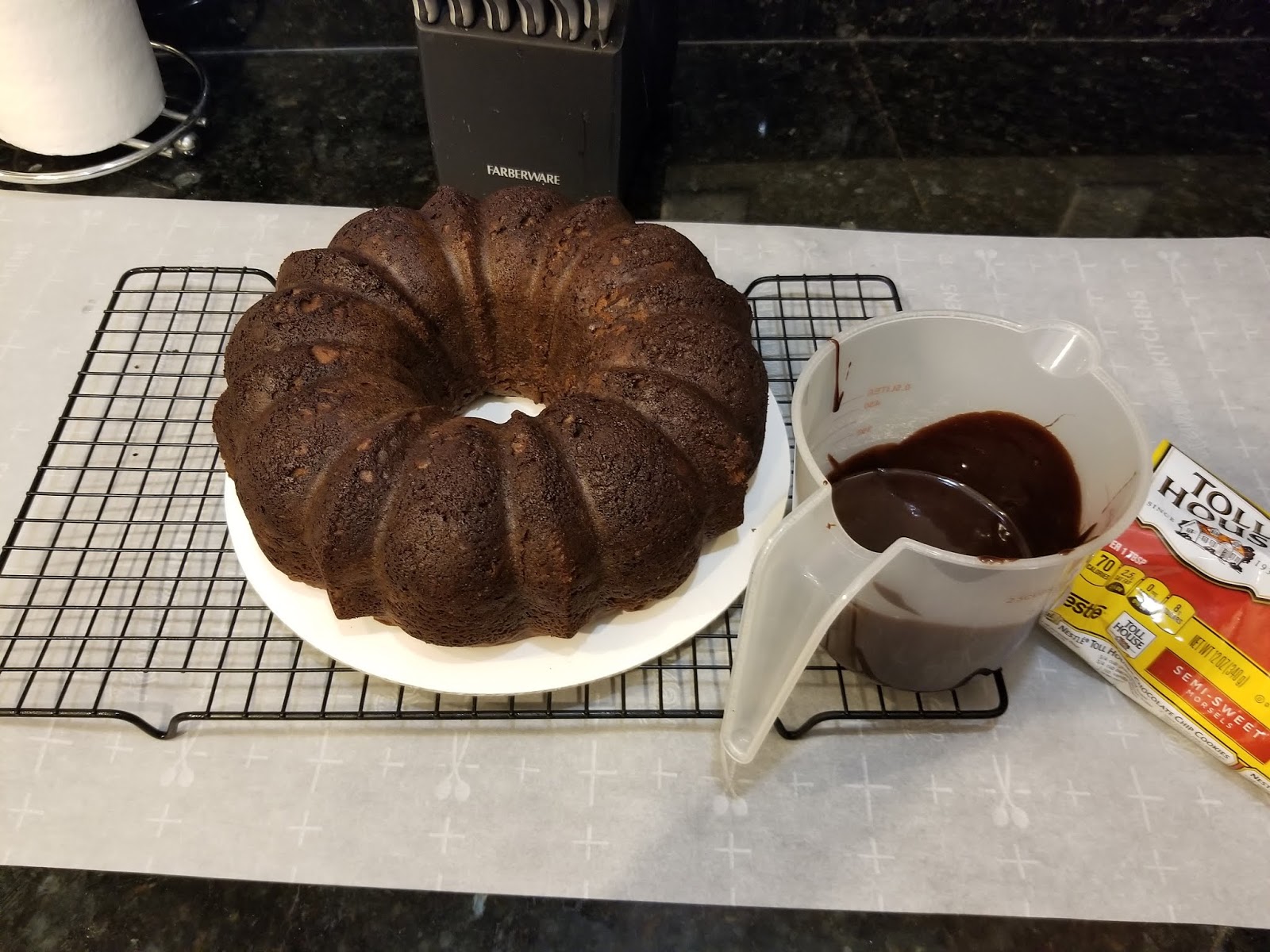 Take your bundt cake out of the freezer and place on a cake round or cake plate on top of a cooling rack. I placed a layer of Parchment paper under my cake round so I could control the messy chaos. Once my ganache had firmed up, I slowly drizzled it back and forth over the top of my cooled cake.