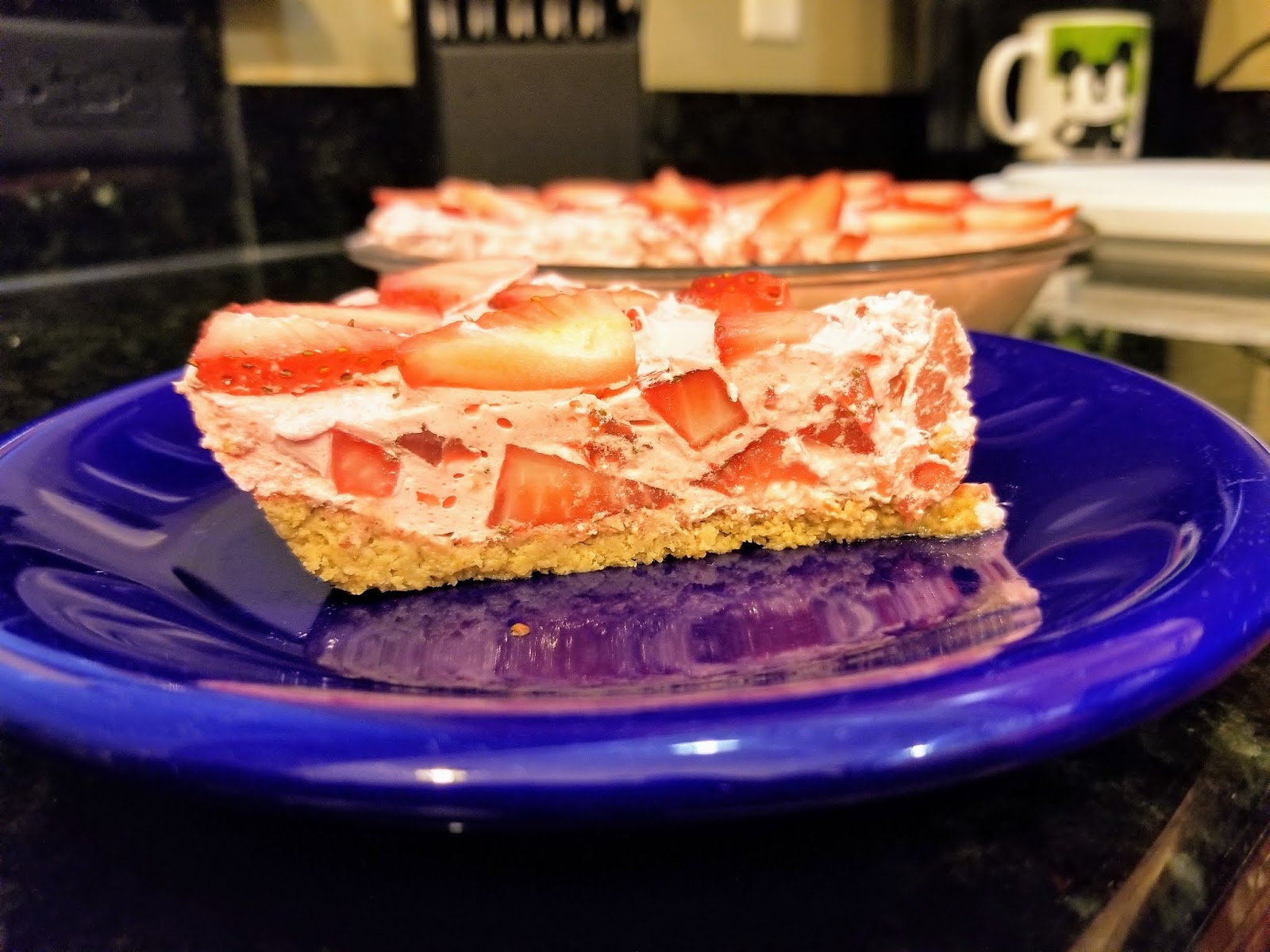 After those long, grueling hours of wanting to eat pie and not being able to, the time has finally come. Slice up, enjoy, repeat. Low calorie, but not low flavor. The cinnamon crust and the sweet filling are a combination so great, you will forget you live on the surface of the sun. It’s nice and cool while also being delicious and satisfying. I sincerely enjoyed this pie, and my Jello-tooth-PTSD was a non issue since it’s mostly there to add some extremely yummy strawberry flavor to the pie.