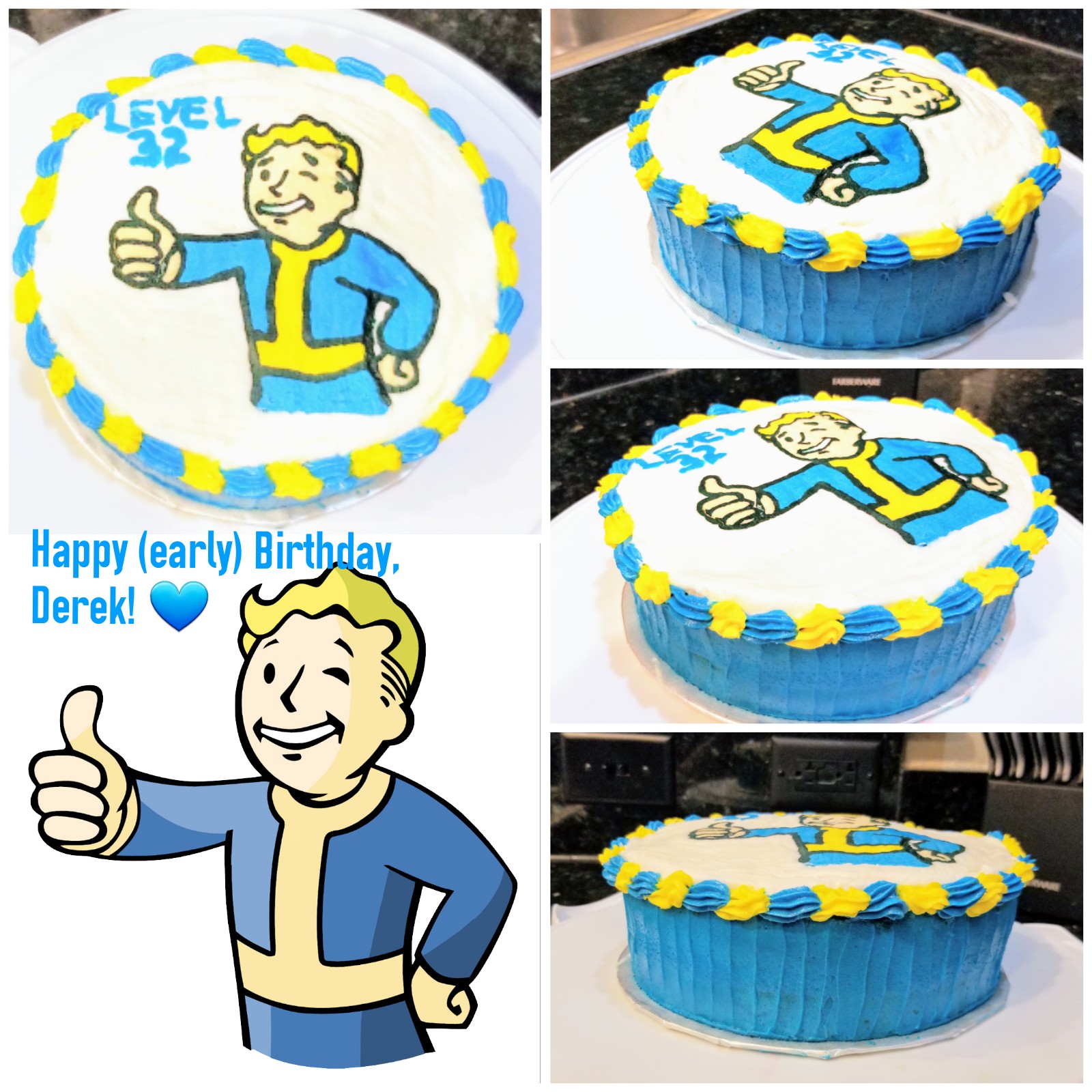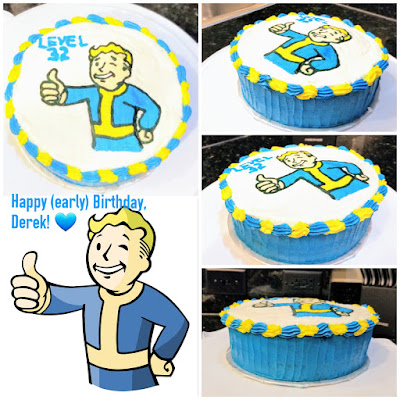 One of my husband’s (and my) favorite video game series is Fallout. I got to thinking about it the other day, and there are quite a few parallels between the post-nuclear world of the Fallout series and the state of Florida (go with me on this, it’s worth the ride). In Fallout, radioactive bugs the size of children exist. In Florida, the cockroaches are easily larger than a toddler. In Fallout, you’re not *quite* sure, but everyone seems crazy and like they *may* be trying to kill you. In Florida, you’re *definitely* sure that everyone is crazy and they are *definitely* trying to kill you. In Fallout, areas of toxic clouds hang around and really ruin your day. In Florida, we call these “tourists.” See? Eerily similar. Maybe the game creators were from here. This would make a lot of sense because the entire state is already in the throws of total chaos, so it’s an easy jumping off point creatively. We’re not bartering for bottle caps (yet) like in Fallout, but Disney Dollars are currency here, so yeah. I swear all of this relates to cake. We’re celebrating my husband’s birthday early since we’ll be traveling on his birthday, so I made him a Vault Boy birthday cake to celebrate making it to Level 32: