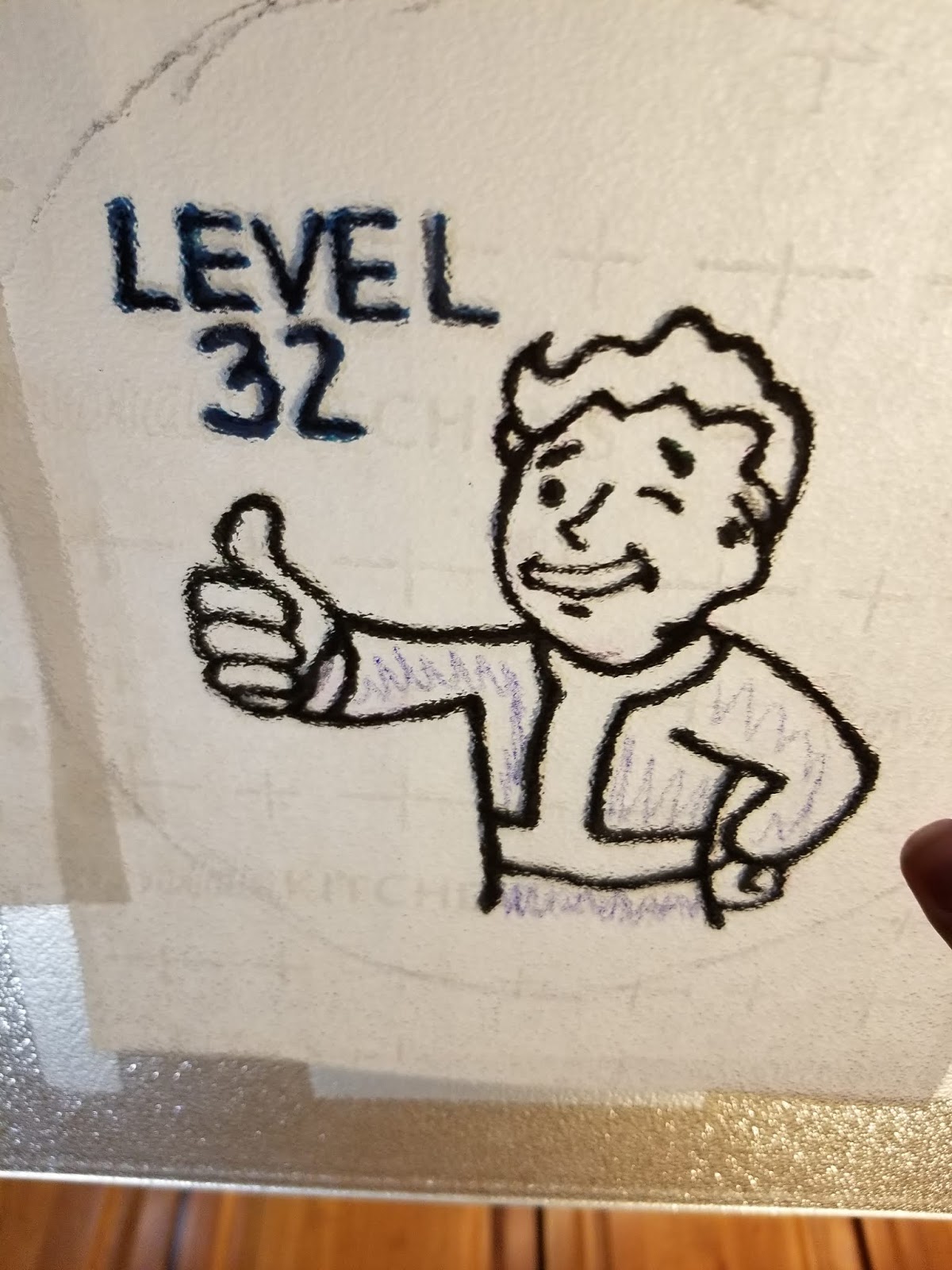 I outlined Vault Boy, clearly way too cheery considering his circumstances, and wrote in my LEVEL 32 before peeking at my work up to very bright kitchen lights: