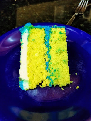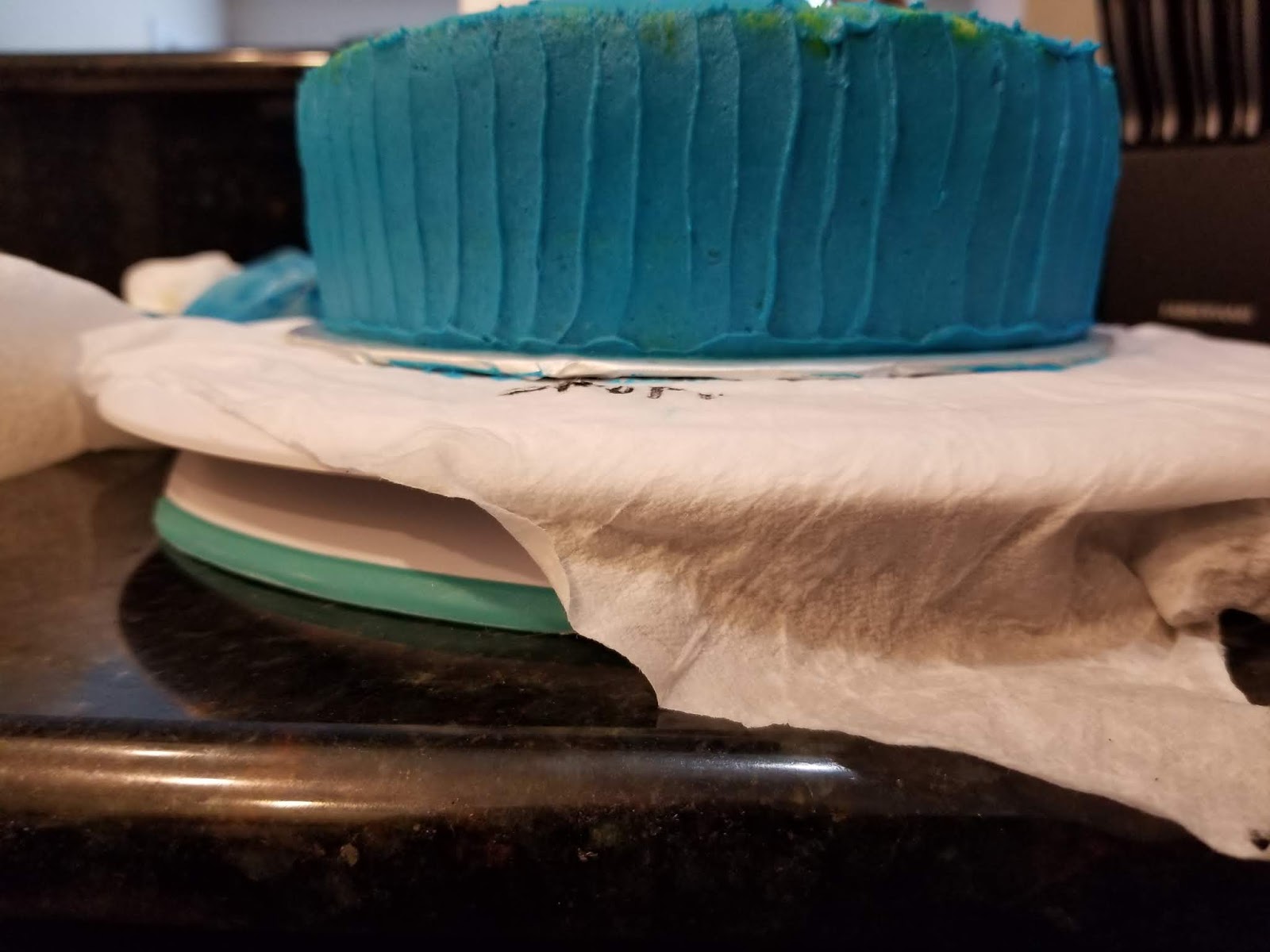 | It gave a nice, festive edge to the cake. Kinda like a giant cupcake wrapper in what I call “Radioactive Blue.” |