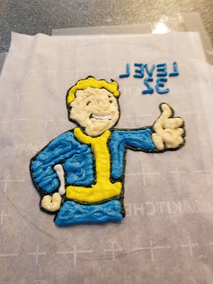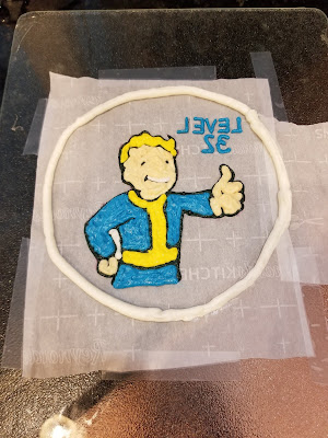The next day, or as I was calling it, “Day 3 of the hostage situation,” I came back in with my large white frosting with #12 tip and traced all around Vault Boy, using a larger paint brush to press in any gaps.
