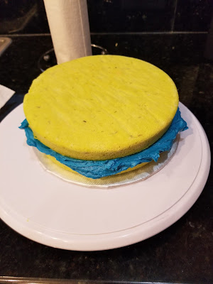 Once all gaps were smoothed, it was time for my transfer to go live in the freezer for a full 24-hours. I had leftover frosting of all colors, but I only needed my blue and yellow to finish the cake. I used almost all of both of these colors to finish assembling. I did not crumb coat since I was trying to save some calories, but definitely had enough frosting to do so if you need a thicker base. I may or may not have mainlined my beige frosting from the bag straight into my mouth because as someone who doesn’t drink, I really needed a stiff margarita after working on that transfer for three days straight.