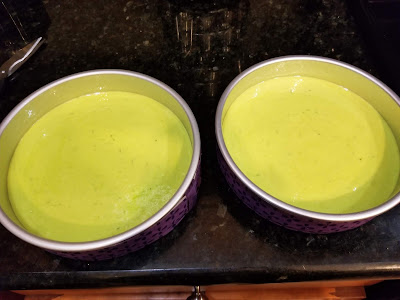 Start by preheating your oven to 350. Add the mix, eggs, apple sauce, and lime zest to the bowl of your stand mixer. Give a quick whirl to barely blend ingredients together, and then add in the milk, lime juice, tequila, triple sec, and vanilla (and green dye if adding) and blend on medium-high for 2 minutes. Prepare two 8-inch cake pans with Parchment paper and cooking spray.