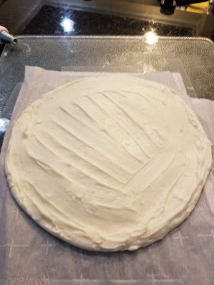Pour your batter into your prepared pans, tap on the counter to release air bubbles, and bake at 350 for about 25-28 minutes until done. Place cake pans on a cooling rack for ten minutes before turning out onto the cooling rack to finish cooling completely. Once my cakes were cool, I measured out the size my buttercream transfer needed to be, and then a wrapped each round in 3 layers of plastic wrap. I put each round into a gallon Ziplock and left in the freezer for later in the week when I’d decorate and assemble everything. I knew I’d need a few days for my buttercream transfer, but I wanted it properly sized to the top of the cake, so I needed to bake my rounds first. This method of wrapping and freezing cakes works extremely well–each slice tastes like it was baked yesterday and not last Monday.
