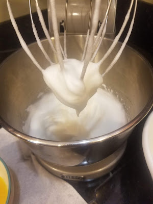 In my research, I found that just about every vertical layer cake gets its flexibly sound structure from meringue, so I separated 6 eggs, holding on to 3 egg yolks for later. I whipped all 6 egg whites on medium high for about 5 minutes. You’ll know things are ready when you can lift up you mixer’s whisk and both stiff peaks have formed in the whites and the bit that stays attached to the whisk isn’t dripping. Carefully transfer this to a medium bowl, then mix together the egg yolks, creme soda, cake mix, and coconut extract for 2 minutes on medium high. Fold in your fluffy egg whites gently by hand to keep as much air in the cake as you can.