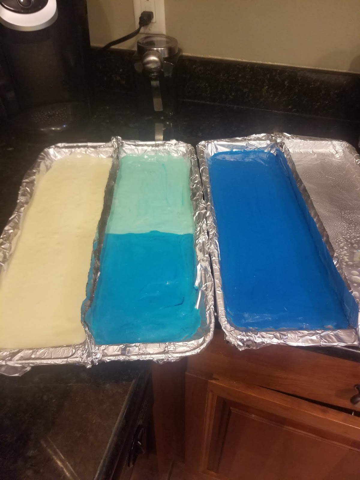 I then took 250 grams of plain white cake mix and spooned it into one half of my prepared pan. In hindsight, I’d do half white, half much paler blue next time. There was a lot of white on the inside of the cake, so another transition color for the ombre would’ve made it perfect. I then took 125 grams of white cake mix, set it in a bowl, and placed a small amount of sky blue dye with it and mixed before turning out into half of one of my little foil gutters. I took another 125 grams of white cake mix, set it in the same bowl, and dyed this electric blue before turning out into the other half of the foil gutter holding the sky blue cake mix. Carefully smooth out, trying not to disrupt between the two blues too much. Finally, I dumped whatever was left (scale be damned! ..but seriously, I can’t live without my digital scale) into the same bowl and dyed royal blue before putting into my last foil gutter and smoothing out.