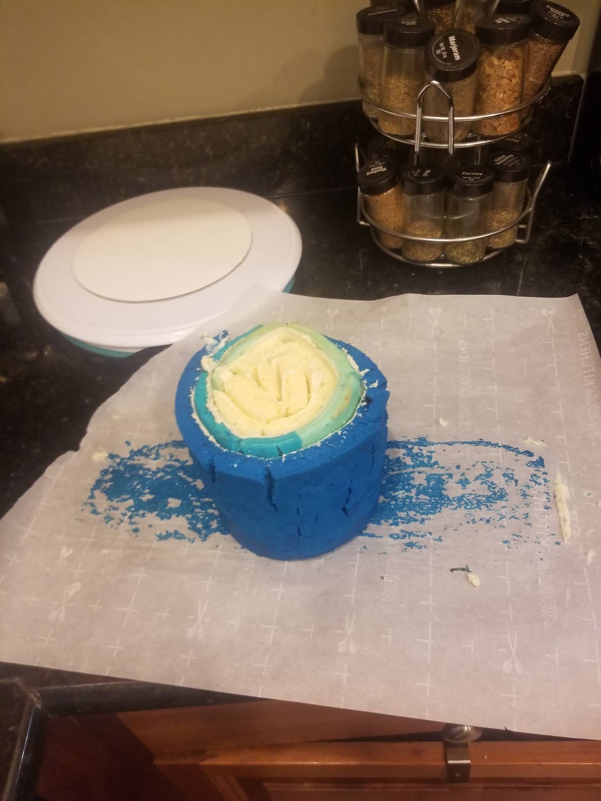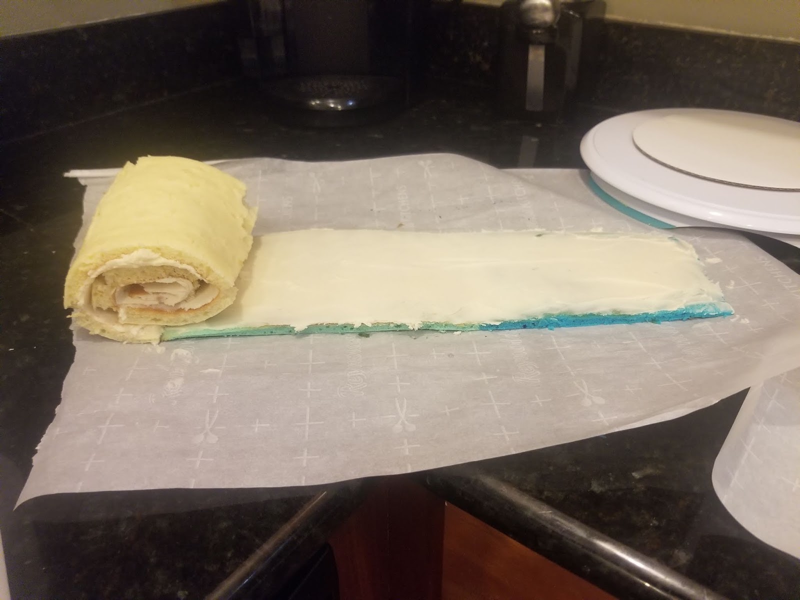 Roll up the white layer first from the short end, since it will be the inside of your cake. Things will crack and break, but the frosting will help hold everything together. The world’s most delicious glue! Take the end of the white cake roll, and place it flush to the lightest blue shade of frosted cake. Continue to roll up. Place this flush with the final layer of dark blue cake and roll up. Flip that cake and set it on it’s side (now bottom). What you have should look like this: