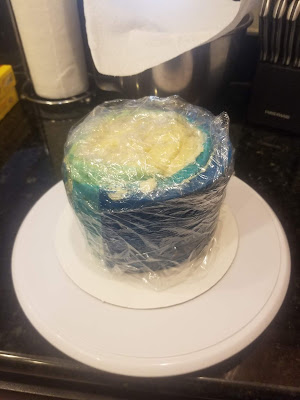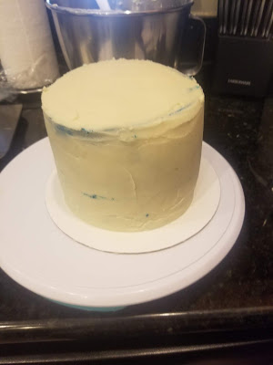 While this is setting up, make sure your frosting gets covered up as well. You can leave it out so it stays at room temp and is easier to spread. Once your cake is firmed up, spread a thin layer of plain white frosting all over the top and sides.