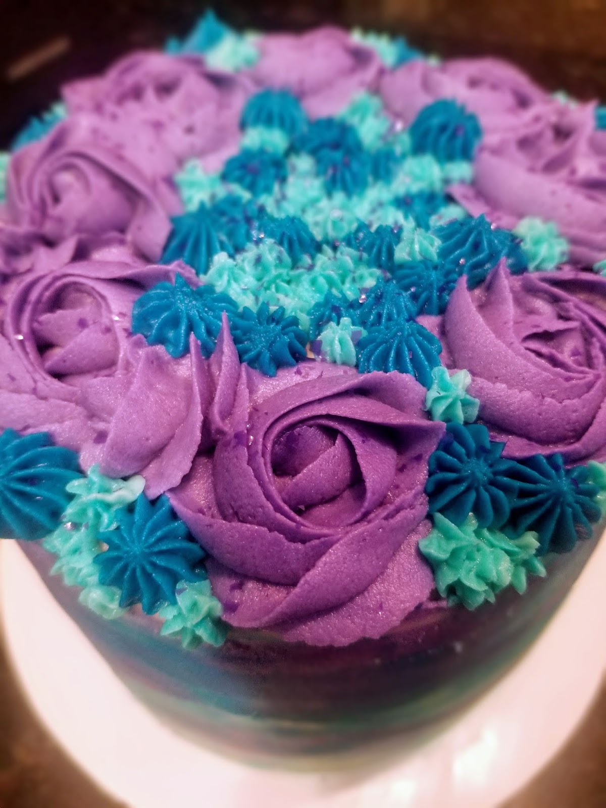 I made roses around the entire border of the cake by swirling my 2D tip in a circle, starting in the middle of a small section of border and swirling my way out and around. I came back in with the electric blue and made large stars by piping a mound of frosting and quickly pulling away. I did these at random, but tried to cover up any weird white space between or under roses. I finished up by using the tiny tip on the sky blue frosting to make the littlest, most adorable stars to fill in any remaining white space. I had about 6 tablespoons of frosting left, and maybe mainlined one bag onto some cake scraps and ate to sample the goods. This is why you never throw away cake scraps until you’re totally done decorating. You’re welcome.