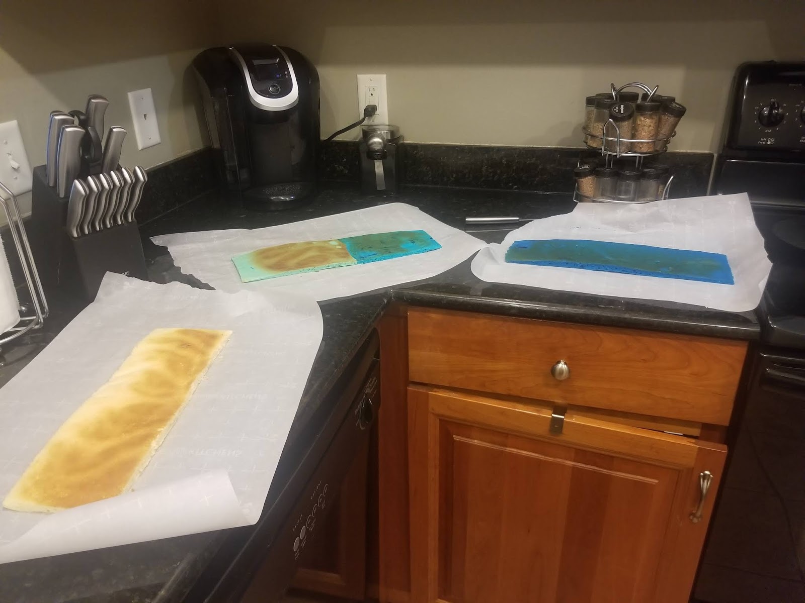 If you’re not interested in dying your cake layers different colors, just throw some Parchment down on a half sheet pan (18×13 inches) and lightly grease before pouring in all your batter. I used foil to create sections. I used 2 of these pans but only needed 3 sections, so my other pan had one tinfoil section only. Lightly spray with Pam and set aside.