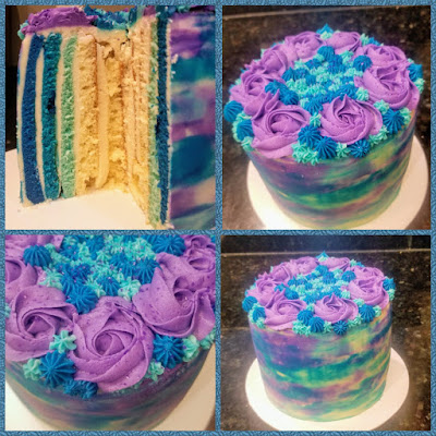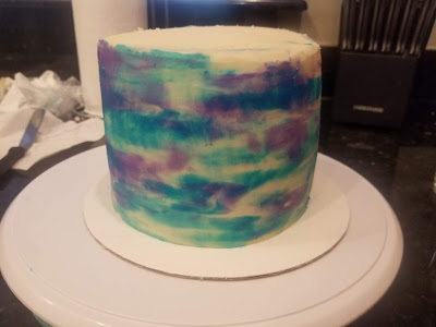 I used enough frosting on top to completely cover up the edges of the roll and create a flat surface. You don’t need as much on the side if you’re watercolor decorating it. I took my remaining dye (there won’t be a ton, but you don’t need much), split it into three bowls, dying one sky blue, one electric blue, and another purple.