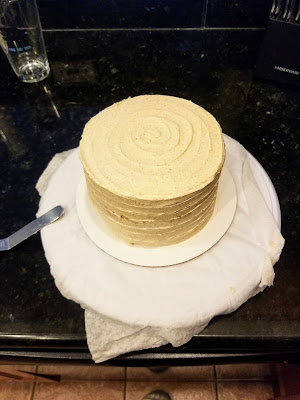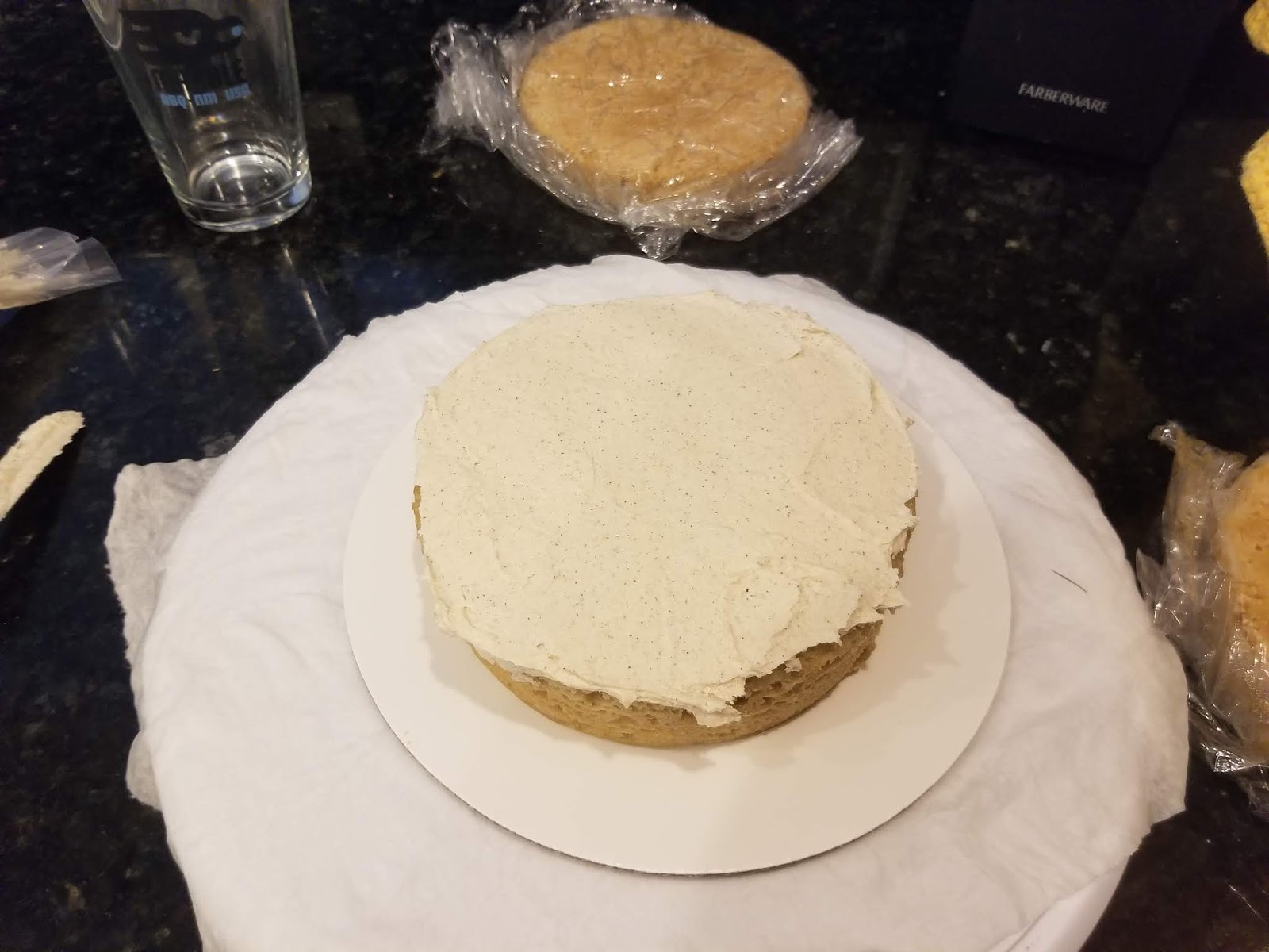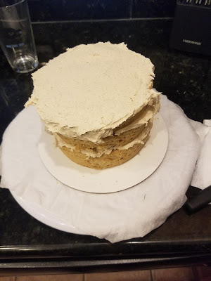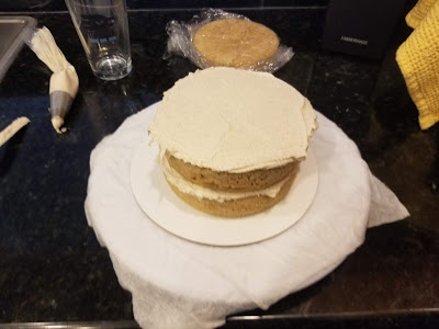 Add the next layer, slather with more frosting, and then get ready for the final layer.