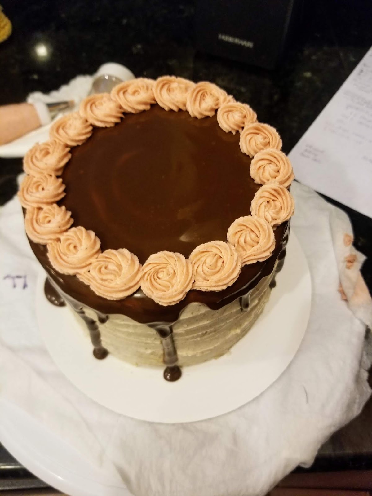 I was also going to pipe mums on my cake for optimal fall decorum, but my frosting wasn’t thick enough. Winging it once more all for the sake of cake (I would do anything for cake, including inciting my very own panic attack), I took the remainder of my frosting, dyed it a light peach shade, and put it into a piping bag with a #21 open star tip. Starting in the middle, I made small rosettes by swirling out and around my center starting point.