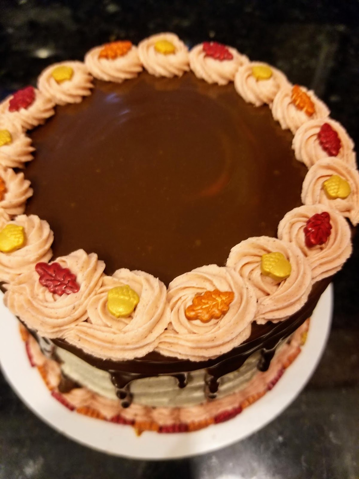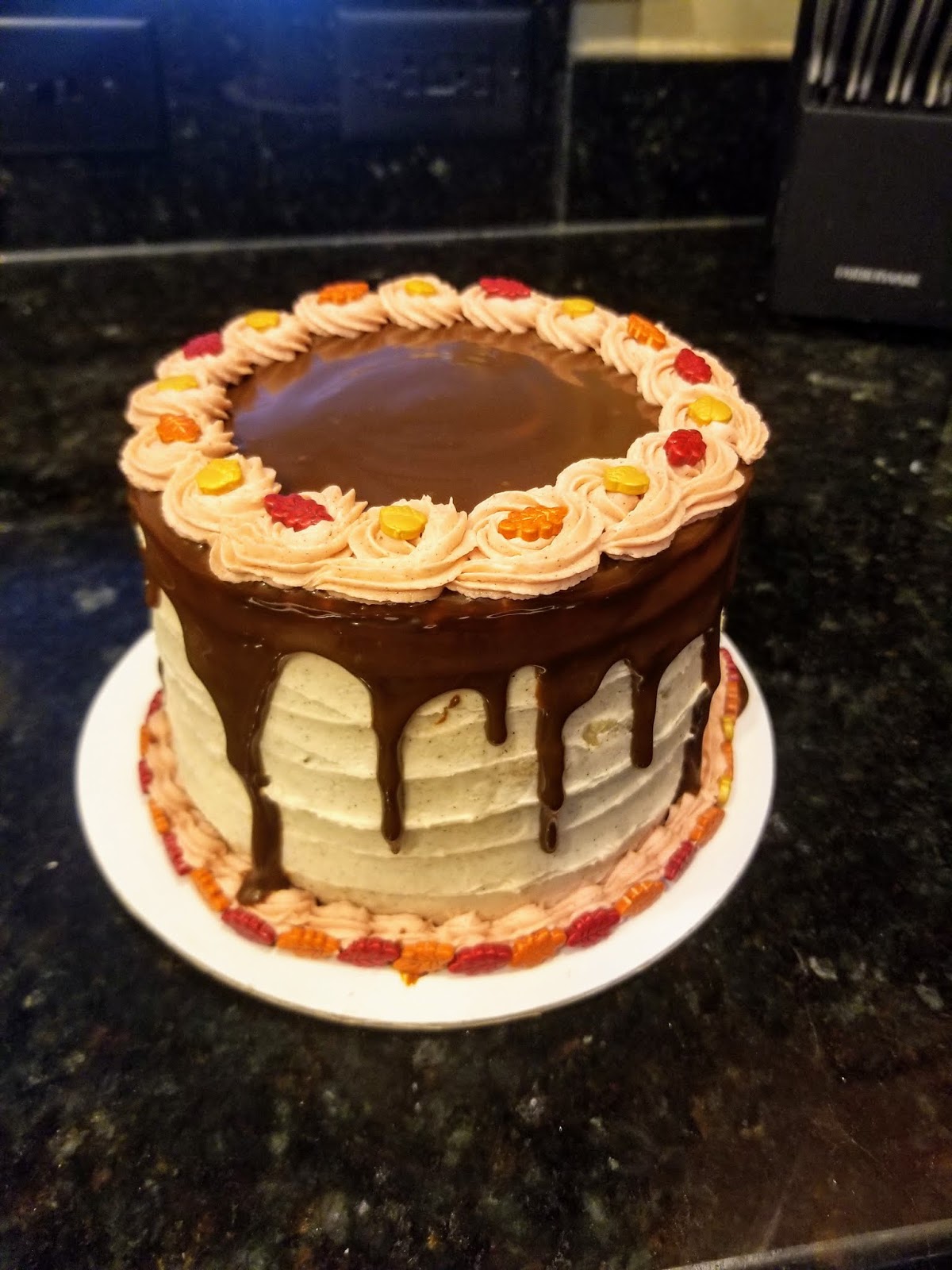I bought these off Amazon last year (they’re Wilton brand fall sprinkles). I wasn’t sure if I’d have the chance to use them this year, but lucky me, my original plans falling apart entirely! I placed one sprinkle in the center of each rosette, and decided to pipe a shell border at the bottom of my cake…sheerly because I had an insane amount of frosting leftover. I may have cried a little throwing away about 1/3 of my frosting leftovers. It was that or eat it all in one sitting, soooo…