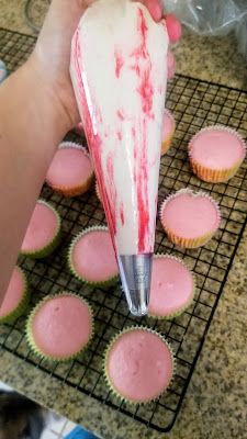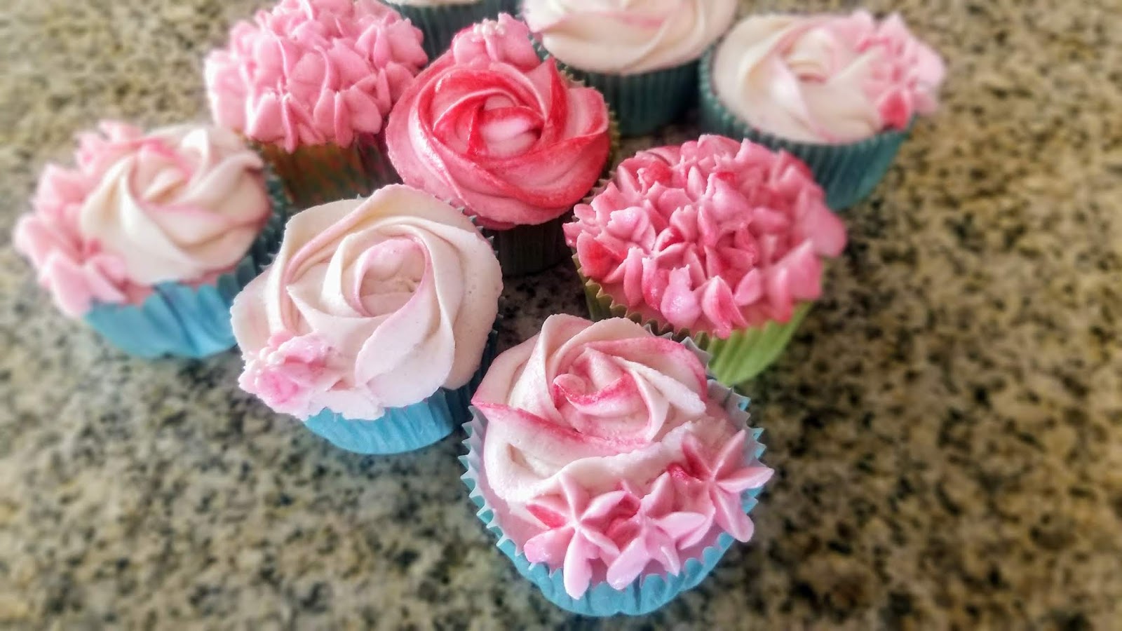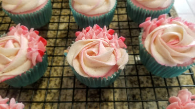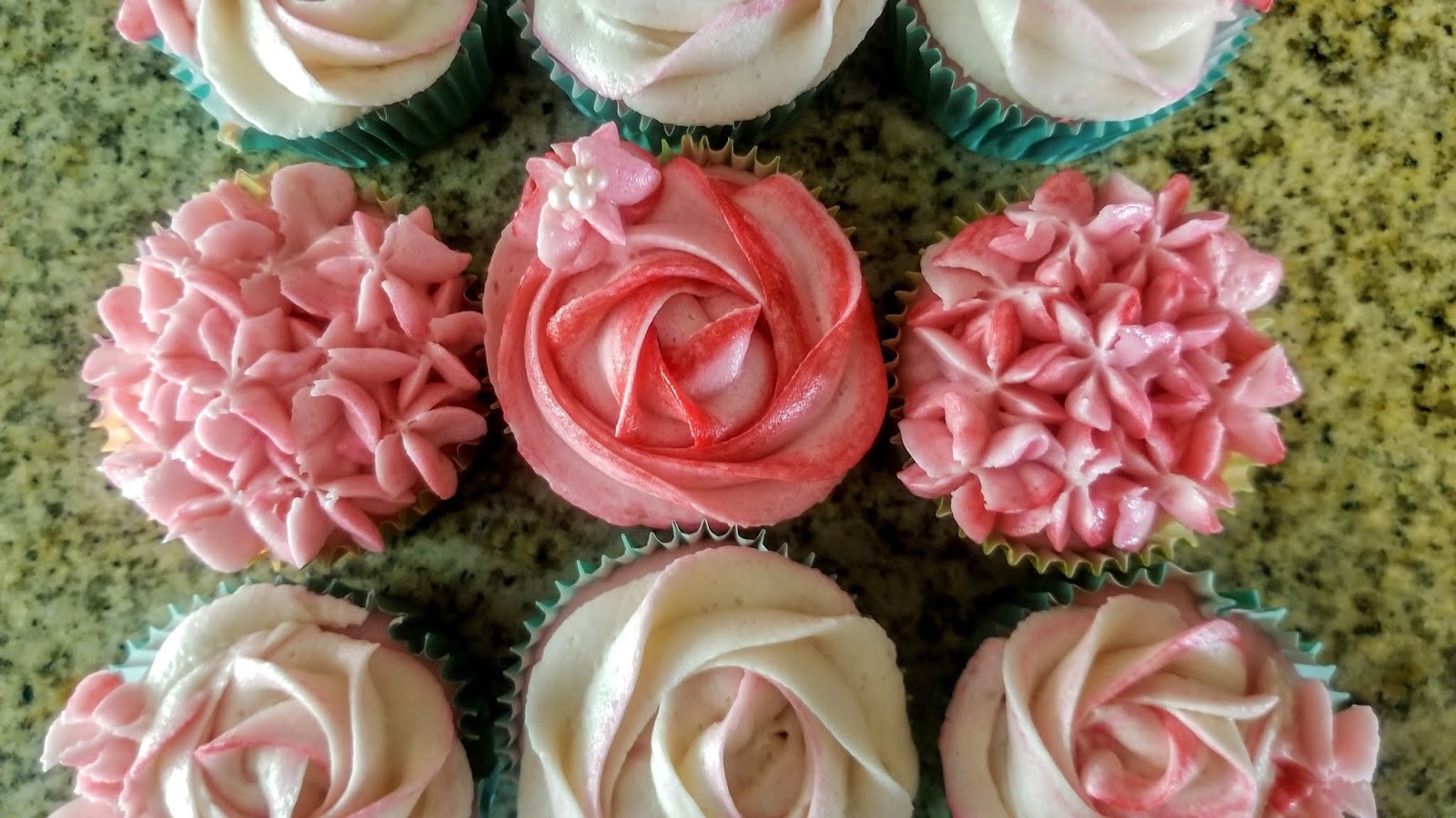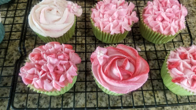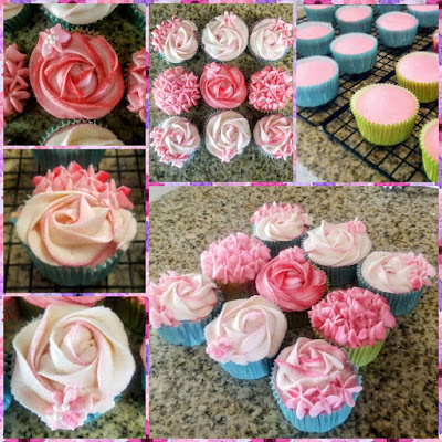 As my gel dye started to fade, I took this opportunity to pipe small 2D roses by starting 2/3 of the way into the cupcake and swirling out and around to form roses with a nice faint pink edge. Then I needed to switch to another prepared bag of frosting as this one ran out. I finished these by piping 3-4 little hot pink hydrangeas beside the roses. This helps to cover the edge where you end your rose.