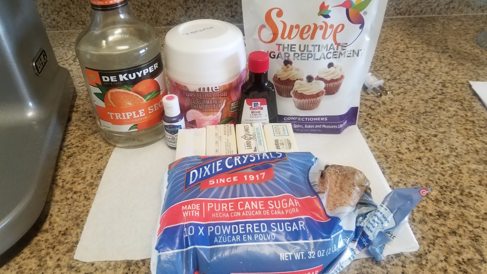 Start by whipping the butter in your stand mixer until fluffy, 3 or so minutes. Grab a measuring cup and measure out the pink lemonade powder, dropping in your measuring cup and then adding the Triple Sec to it. Stir until the pink lemonade powder has dissolved, and set aside. Now, add the lemon extract and powdered sugar to your butter. Mix well, scrape down your mixing bowl, and then pour in half the Triple Sec lemonade mix. Blend, scrape, and add the Swerve and second half of the Triple Sec and lemonade mix. I then dyed my frosting a very light shade of hot pink.