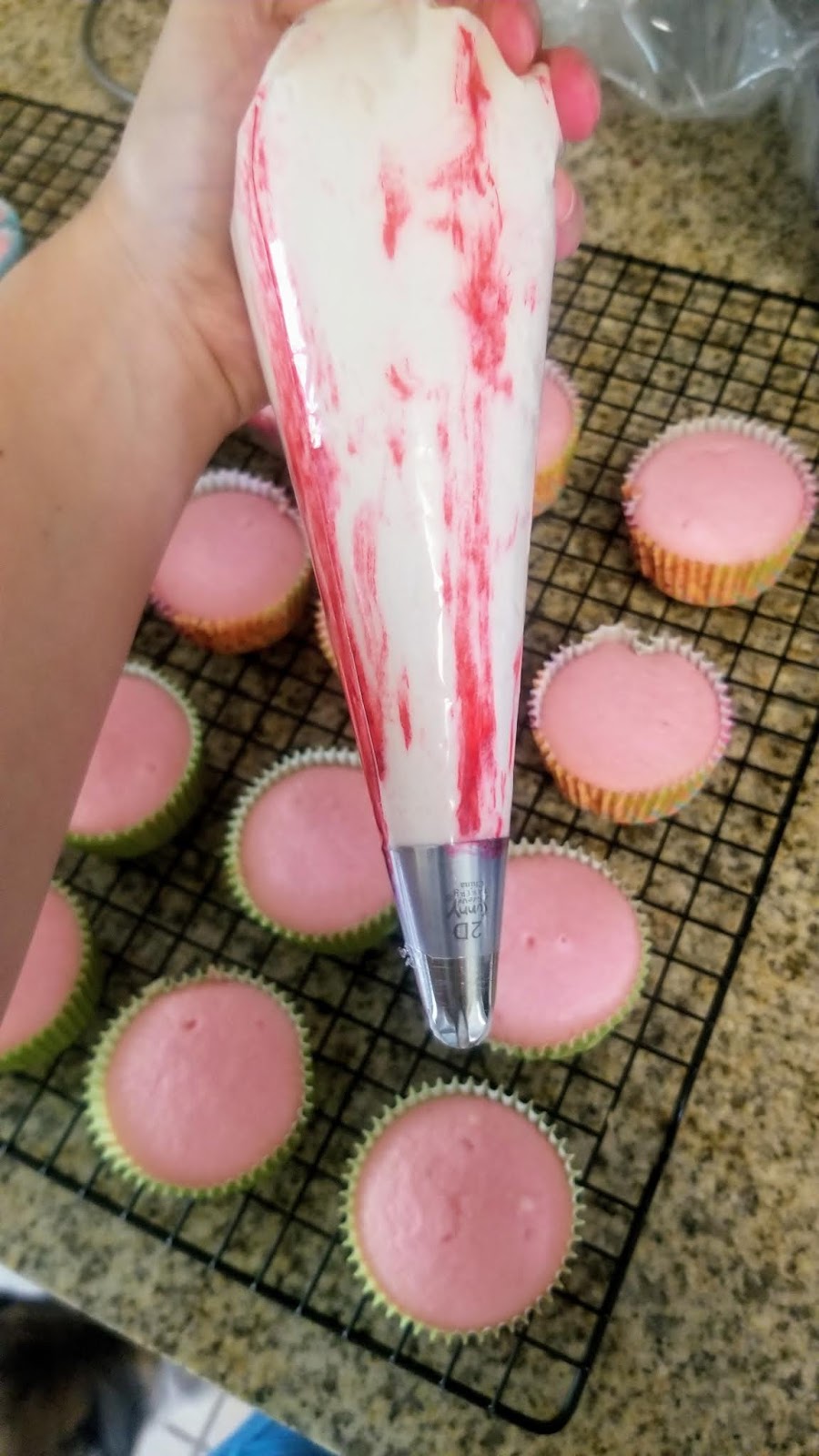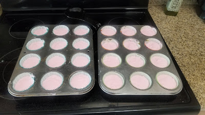 Start by preheating your oven to 350 and lining two muffin tins with cupcake liners (24). Mix all ingredients except for the gel dye on medium-high for 2 minutes, then add in a few drops of hot pink dye to give your cupcakes a nice pink hue.
